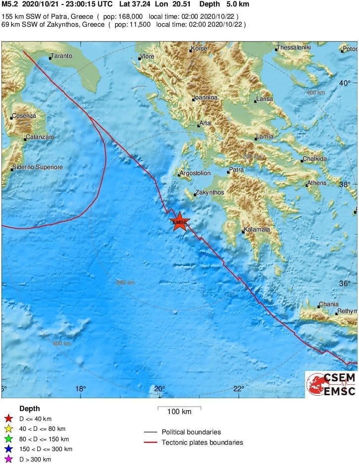 Prema podacima EMSC-a, magnituda potresa bila je 5.2 po Richteru, a epicentar je bio 76 kilometara od Zakynthosa.