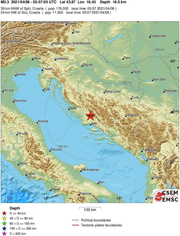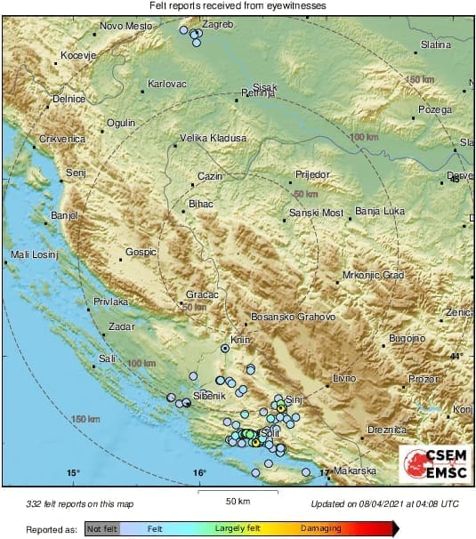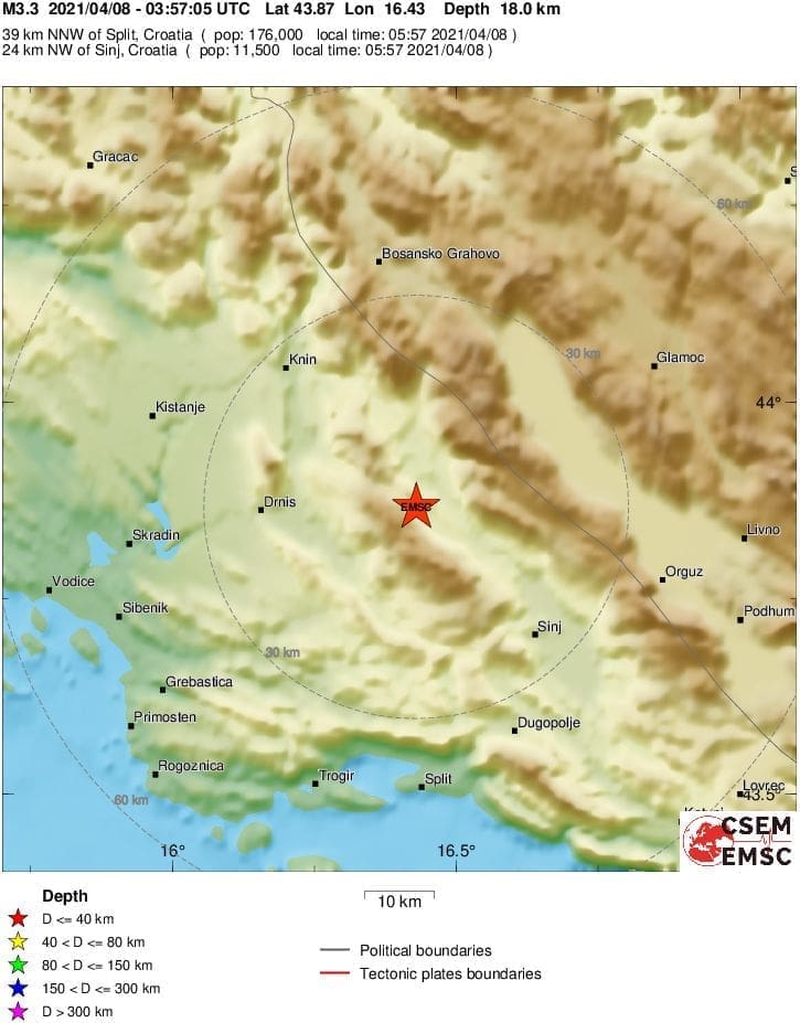 "Jutros, 8. travnja 2021. godine u 5 sati i 57 minuta seizmografi Seizmološke službe Republike Hrvatske zabilježili su umjeren potres s epicentrom kod Peručkog jezera, 22 km istočno od Drniša. Magnituda potresa iznosila je 3.2 prema Richteru, a intenzitet u epicentru IV stupnja EMS ljestvice."