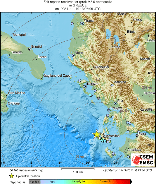 M5.0 #earthquake (#σεισμός) strikes 97 km W of #Μεσολόγγι (#Greece) 11 min ago. Updated map of its effects: pic.twitter.com/xLqXGaiEi5