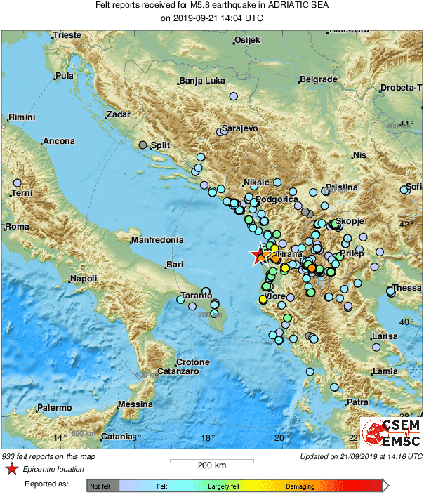 Epicentar potresa bio je 6 kilometara sjeverno od Drača u Albaniji, na samoj obali.