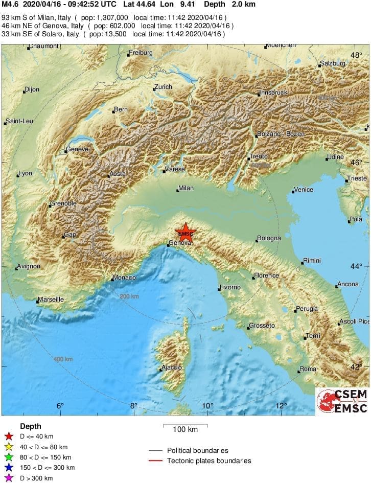 Snažan potres zatresao je sjevernu Italiju u 11 sati 42 minute. Prema informacijama EMSC-a magnituda potresa bila je 4,6 po Richteru, a epicentar je bio 93 kilometra južno od Milana.