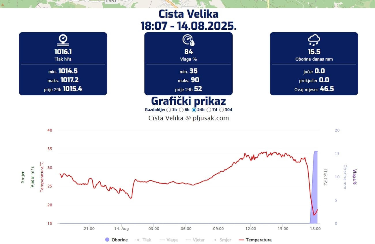 Prema podacima mreže postaja Pljusak.com, do 18 sati od Sonja do Šestanovca palo je 10 do 15 litara kiše po četvornome metru, a oborine su tek počele na splitskom i solinskom području.