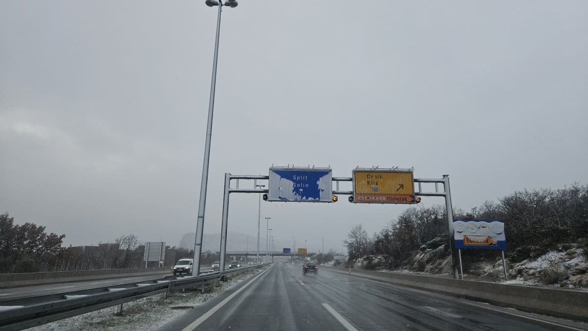 Na brzoj cesti Solin – Klis zabilježen je snijeg pomiješan s kišom, što stvara otežane uvjete za promet. Cesta je mokra i skliska, a vozačima se savjetuje krajnji oprez i prilagodba brzine uvjetima na kolniku.