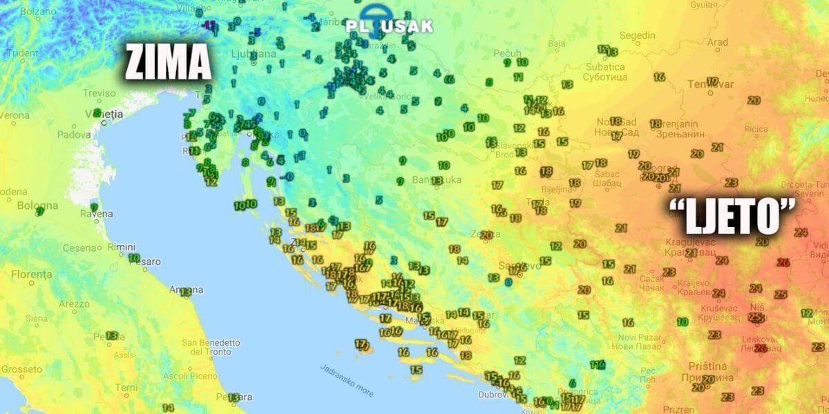 Kako je i bilo najavljeno, ponedjeljak je donio naglu i izraženu promjenu vremena u velikom dijelu zemlje. Podsjetimo, još jučer u unutrašnjosti Hrvatske temperature zrak su rasle do čak 25 Celzijevih stupnjeva, a danas su na tom području temperature prosječno 12 do 20 stupnjeva niže u odnosi na jučerašnje vrijednosti!