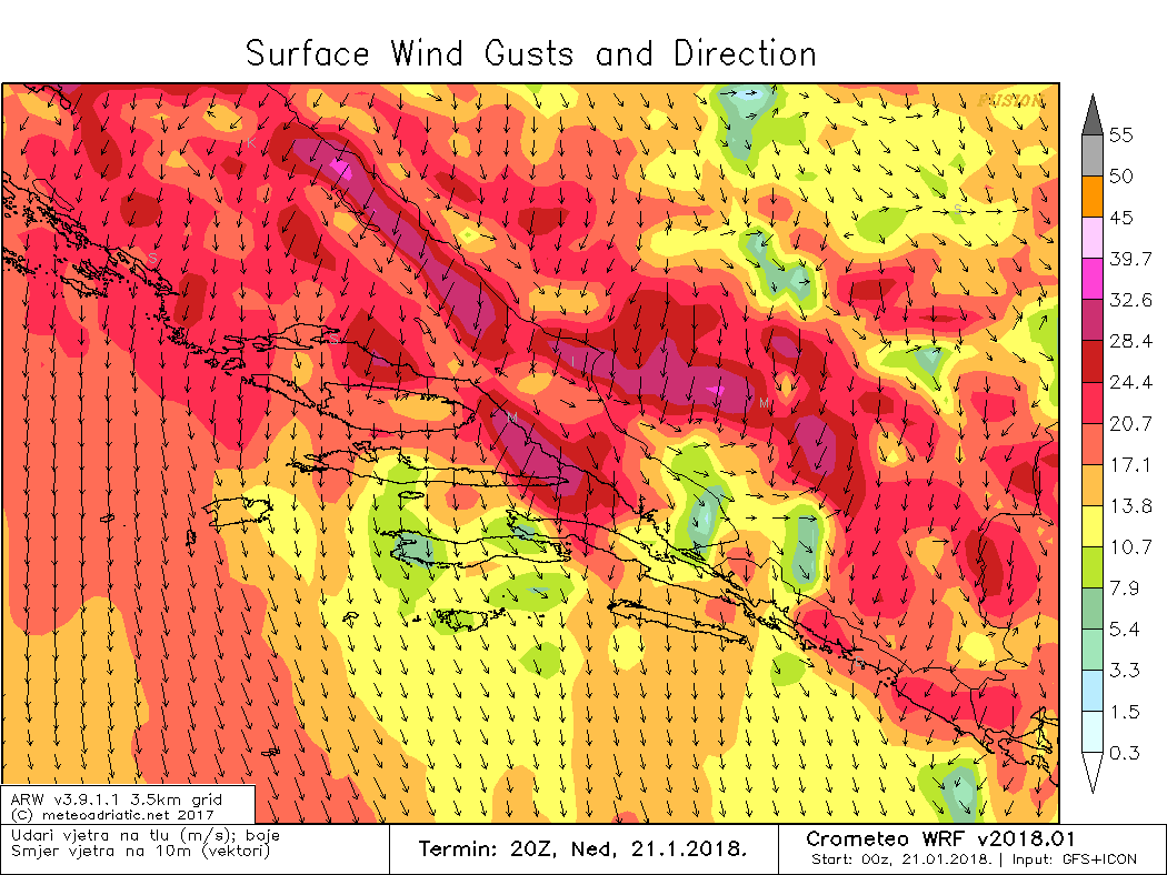 U početku je bilo umjerenog juga, ali je prvo na sjeveru Dalmacije zapuhala tramontana koja će se prema večeri proširiti na cijelu obalu. Navečer i noći na ponedjeljak bit će olujnih udara bure i tramontane.