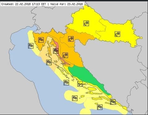 Državni hidrometeorološki zavod za današnji je dan odredio crveni, najviši stupanj upozorenja za opasne meteorloške pojave za područje sjevernog Jadrana, i to zbog bure s mogućim udarima do 120 km/h. Za ostatak države na snazi je niži, narančasti ili žuti stupanj upozorenje, uglavnom zbog snijega i vjetra.
