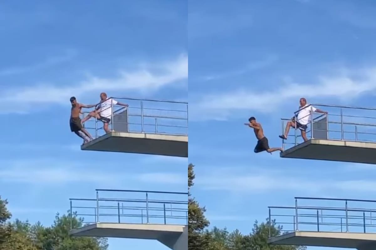 Video koji se širi društvenim mrežama pokazuje čovjeka koji se držao za ogradu na skakaonici, a spasilac ga je nogom gurnuo u leđa nakon čega je pao s 10 metara visokog skakačkog tornja, piše OÖNachrichten.
