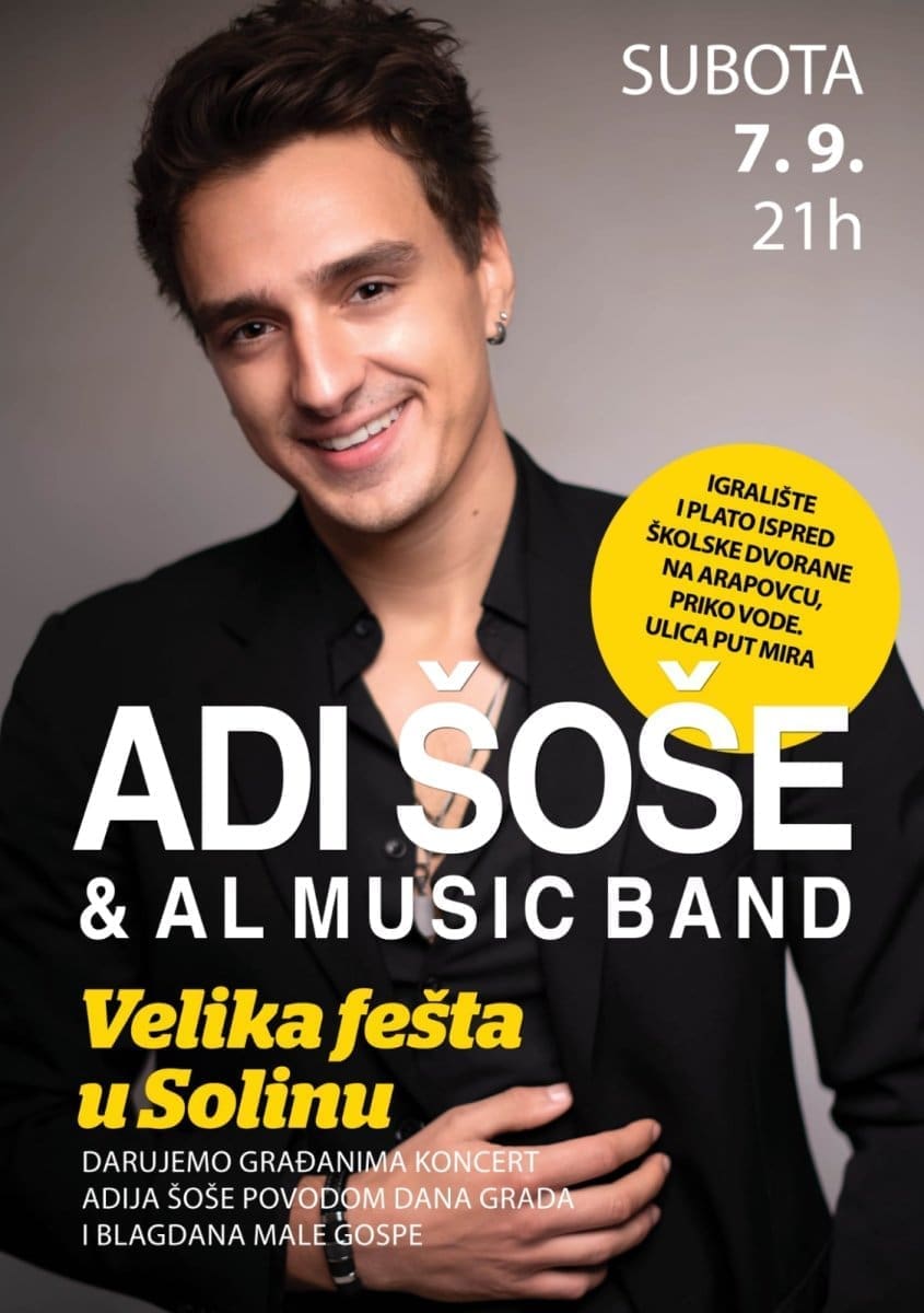 Ali prije toga Adija ove subote 07.rujna u 21.00h čeka velik koncert povodom Dana grada Solina i blagdana Male Gospe na igralištu i platou ispred školske dvorane na Arapovcu.
