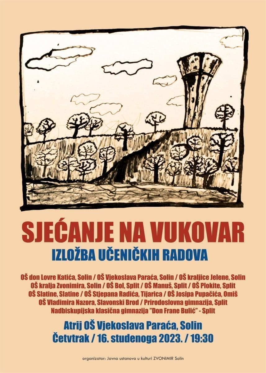 Javna ustanova u kulturi "Zvonimir" Solin povodom obilježavanja Dana sjećanja na žrtvu Vukovara i Škabrnje priređuje izložbu učeničkih radova pod nazivom "Sjećanje na Vukovar" na kojoj sudjeluju učenici OŠ don Lovre Katića - Solin, OŠ Vjekoslava Paraća - Solin, OŠ kraljice Jelene - Solin, OŠ kralja Zvonimira - Solin, OŠ Bol - Split, OŠ Manuš - Split, OŠ Plokite - Split, OŠ Slatine - Slatine, OŠ Stjepana Radića, Tijarica, OŠ Josipa Pupačića - Omiš, OŠ Vladimira Nazora - Slavonski Brod, Prirodoslovne gimnazije - Split i Nadbiskupijske klasične gimnazije "Don Frane Bulić" - Split.