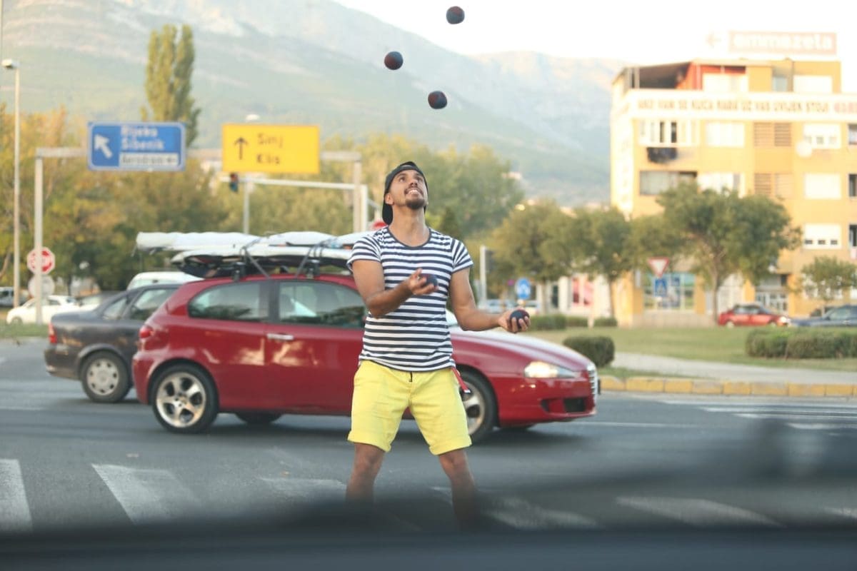 Jedan žongler "zabavljao" je danas vozače na solinskoj Širini i to posred pješačkog prijelaza. Naravno, to je radio na vrijeme dok je na semaforu vozačima bilo upaljeno crveno svjetlo, a maknuo bi se kada bi se upalilo zeleno.
