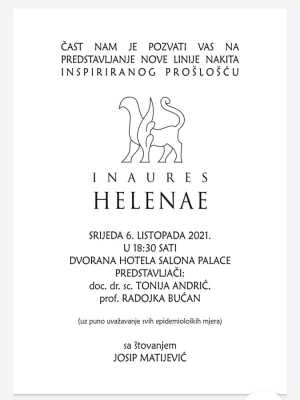 U srijedu , 6. listopada 2021. s početkom u 18:30 sati u dvorani Hotela Salona Palace upriličit će se predstavljanje linije nakita inspiriranog prošlošću pod nazivom „Inaures Helenae“.
