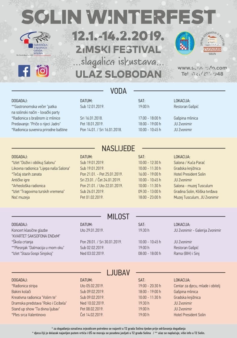 Iz Turističke zajednice napominju kako je ulaz na sva događanja slobodan osim za događanja Lovački party 12.01. i plesnjak „Dalmacija u mom oku“ 02.02. gdje je organizator Restoran Gašpić u suradnji s TZ grada Solina.