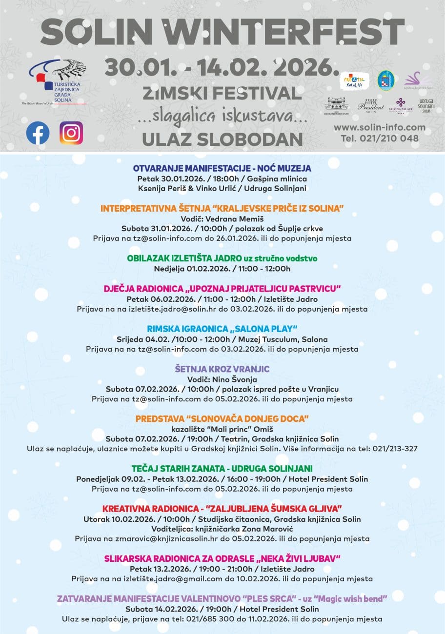 Solin će i ove zime živjeti punim plućima – Solin Winterfest 2026 održava se od 30. siječnja do 14. veljače 2026. na više gradskih lokacija, uz program koji spaja kulturu, baštinu, prirodu i druženje. Festival se kontinuirano održava od 2017. godine s ciljem da Solin bude destinacija 365 dana u godini, a posjetiteljima i domaćima ponudi autentičan doživljaj izvan glavne turističke sezone.