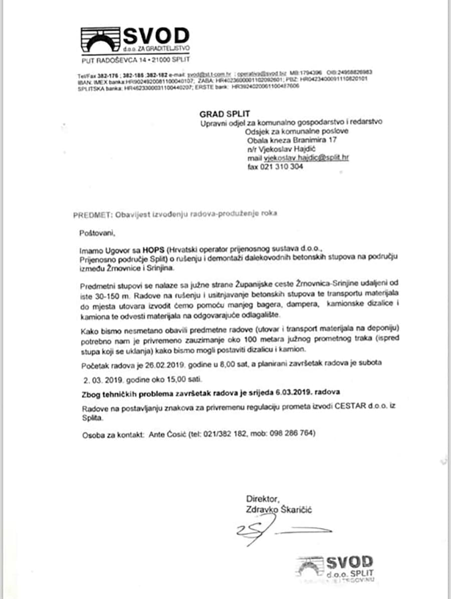 Tvrtka SVOD je s HOPS-om sklopila ugovor o rušenju i demontaži betonskih stupova na području između Žrnovnice i Srinjina. Došli smo u posjed tog ugovora u kojem je jasno da ova tvrtka ne zna elementarne stvari, poput nadležnosti nad cestama na kojima rade. Tako su cestu između Žrnovnice i Srinjina nazvali županijskom, a zapravo je nerazvrstana, odnosno pod upravom Grada Splita.