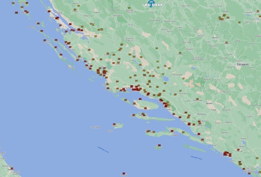 Na karti ispod možete vidjeti kako su izgledale temperature zraka u Dalmaciji oko 1 sat iza ponoći. Dubrovnik je rekorder s čak 31°C!