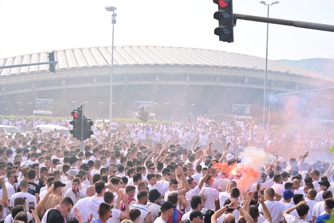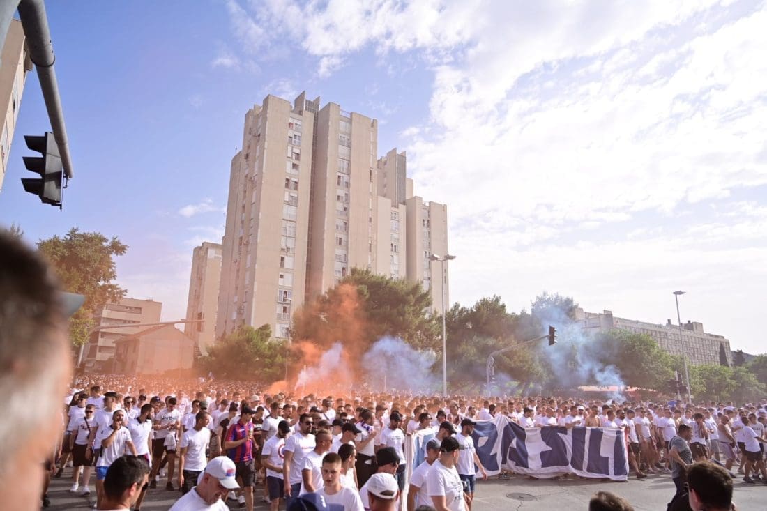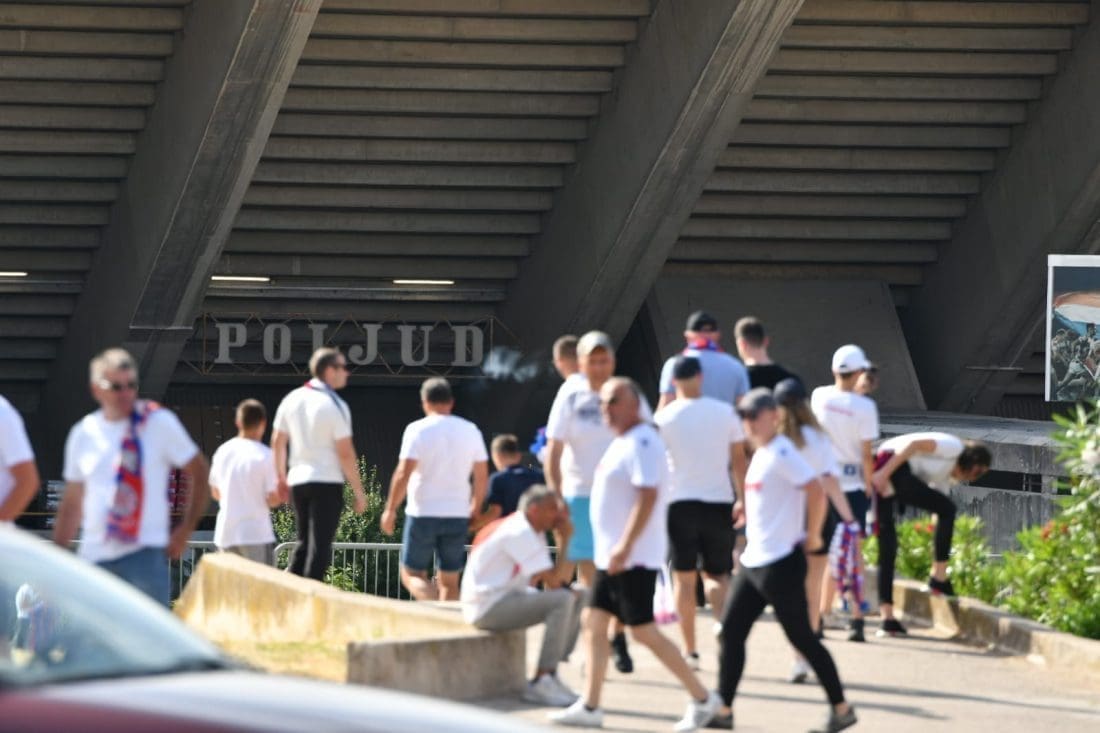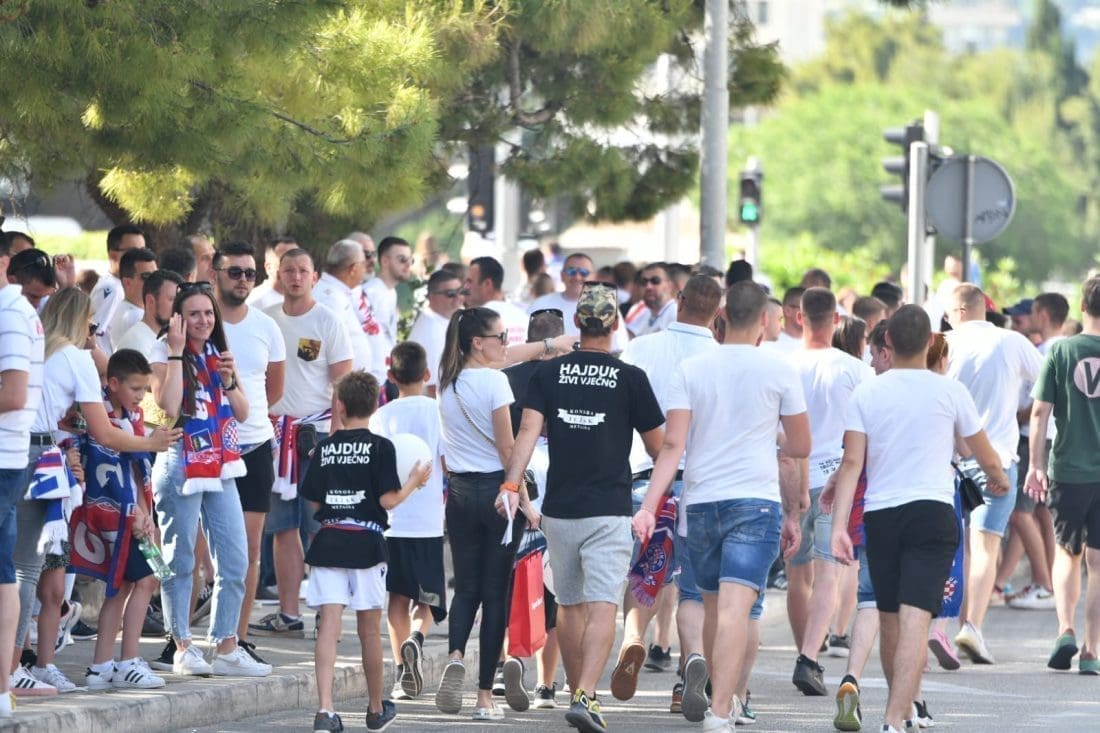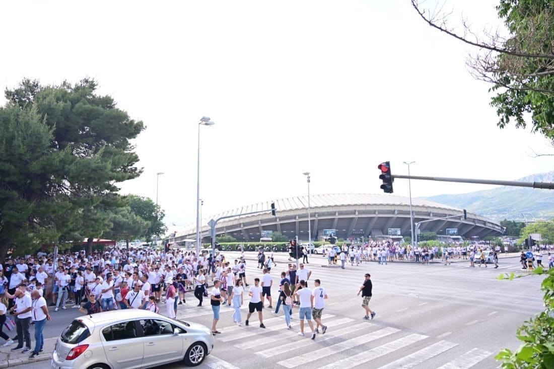 Velika grupa navijača odlazi prema Poljudu i već su mnogi od njih stigli ispred stadiona. Hajduk i Rijeka danas od 19 sati igraju finalnu utakmicu Kupa Hrvatske, a na stadionu se očekuje pravi spektakl.