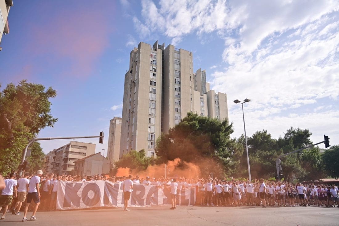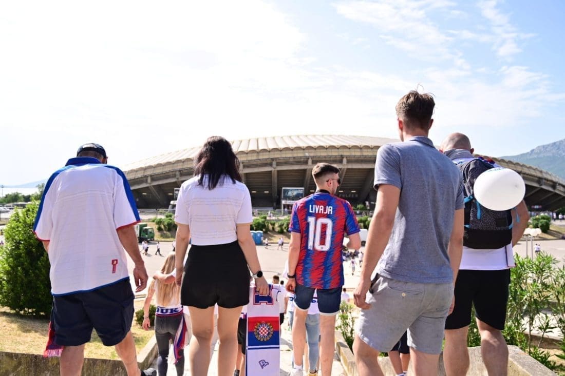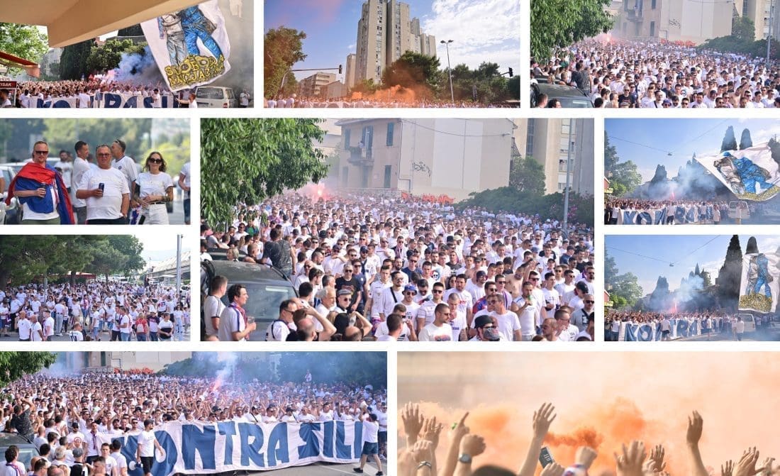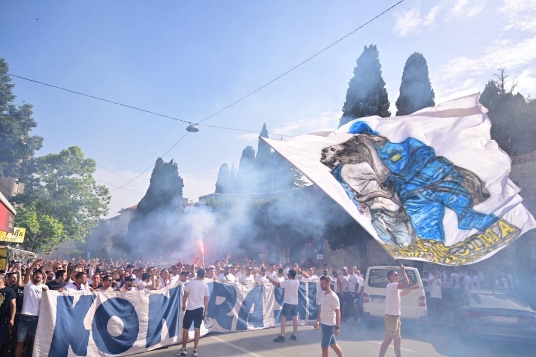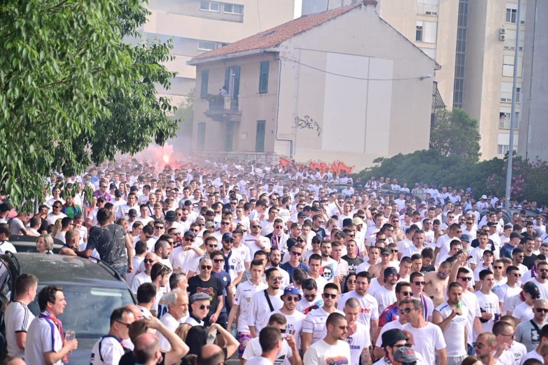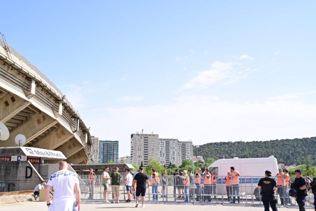 Velika grupa navijača odlazi prema Poljudu i već su mnogi od njih stigli ispred stadiona. Hajduk i Rijeka danas od 19 sati igraju finalnu utakmicu Kupa Hrvatske, a na stadionu se očekuje pravi spektakl.