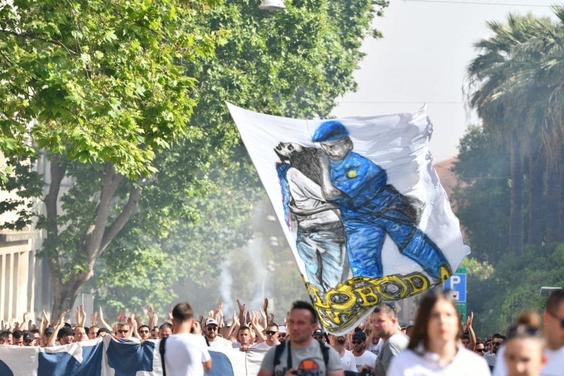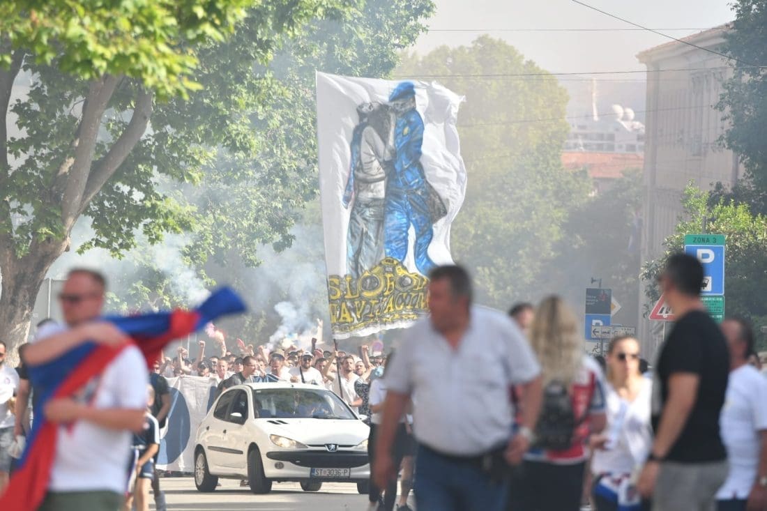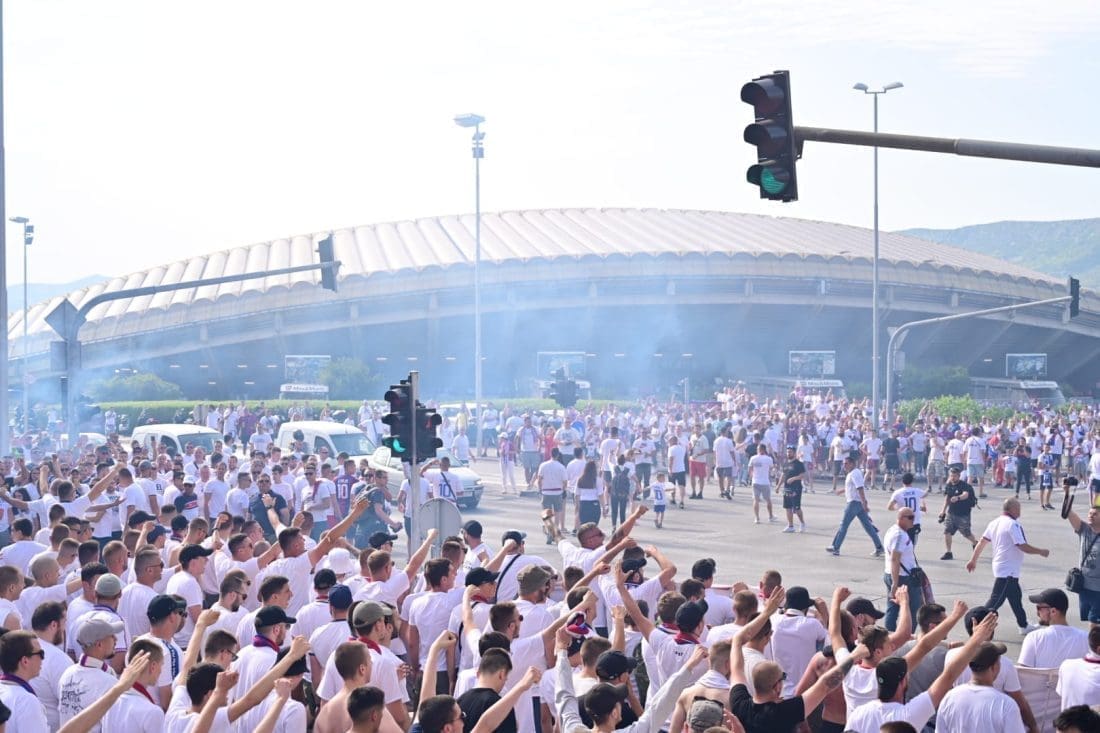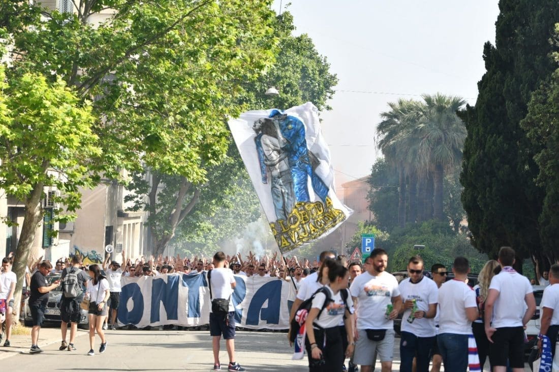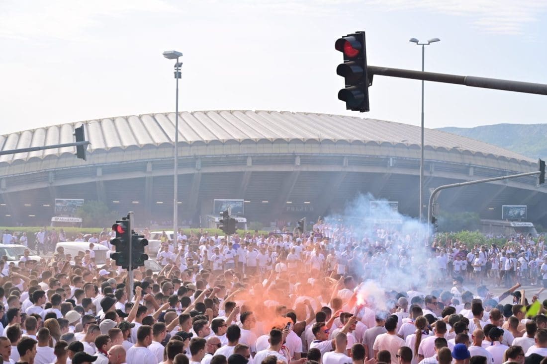 Velika grupa navijača odlazi prema Poljudu i već su mnogi od njih stigli ispred stadiona. Hajduk i Rijeka danas od 19 sati igraju finalnu utakmicu Kupa Hrvatske, a na stadionu se očekuje pravi spektakl.