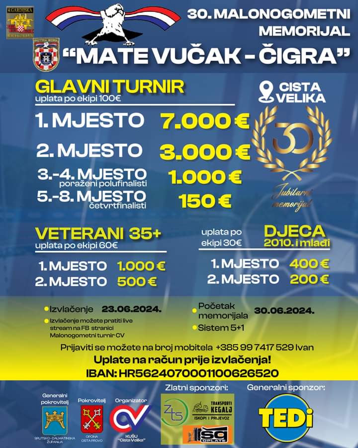 Posljednje nedjelje lipnja u Cisti Velikoj starta jubilarni 30. Malonogometni memorijal Mate Vučak Čigra. Kao i proteklih godina očekuje se na tribinama tijekom trajanja turnira tisuće posjetitelja, a veliko finale na rasporedu 25 srpnja. Organizatori, Kulturno umjetnička športska udruga osigurala je nagradni fond vrijedan 15 tisuća Eura, a prijave momčadi su do nedjelje 23. lipnja kada je i izvlačenje parova.
