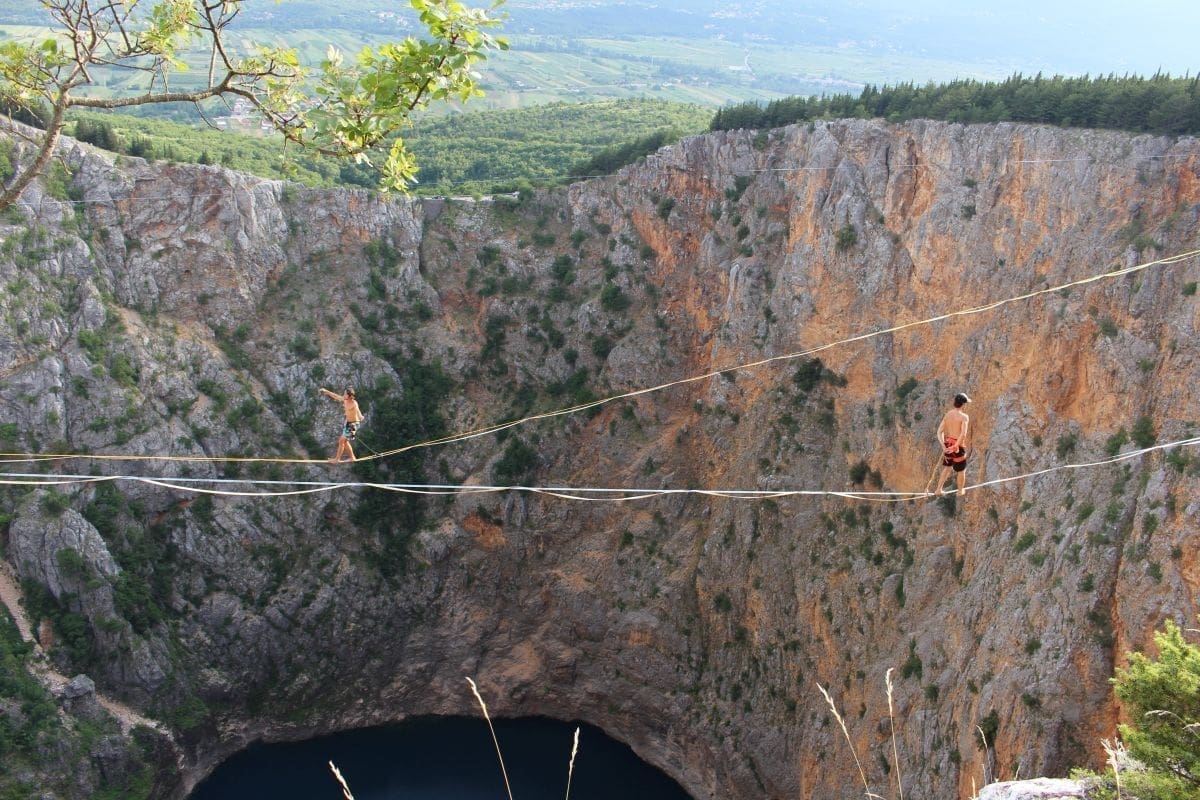 Pravi spektakl odvijat će se uskoro na Modrom jezeru u Imotskom. Austrijsko-njemački highlinersi ponovno su tu i pokušat će oboriti hrvatski rekord.