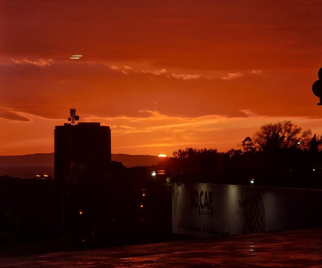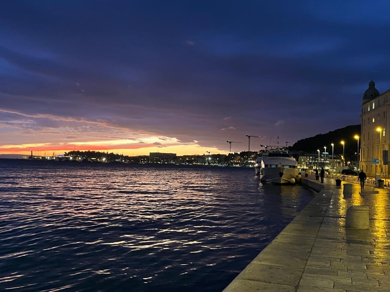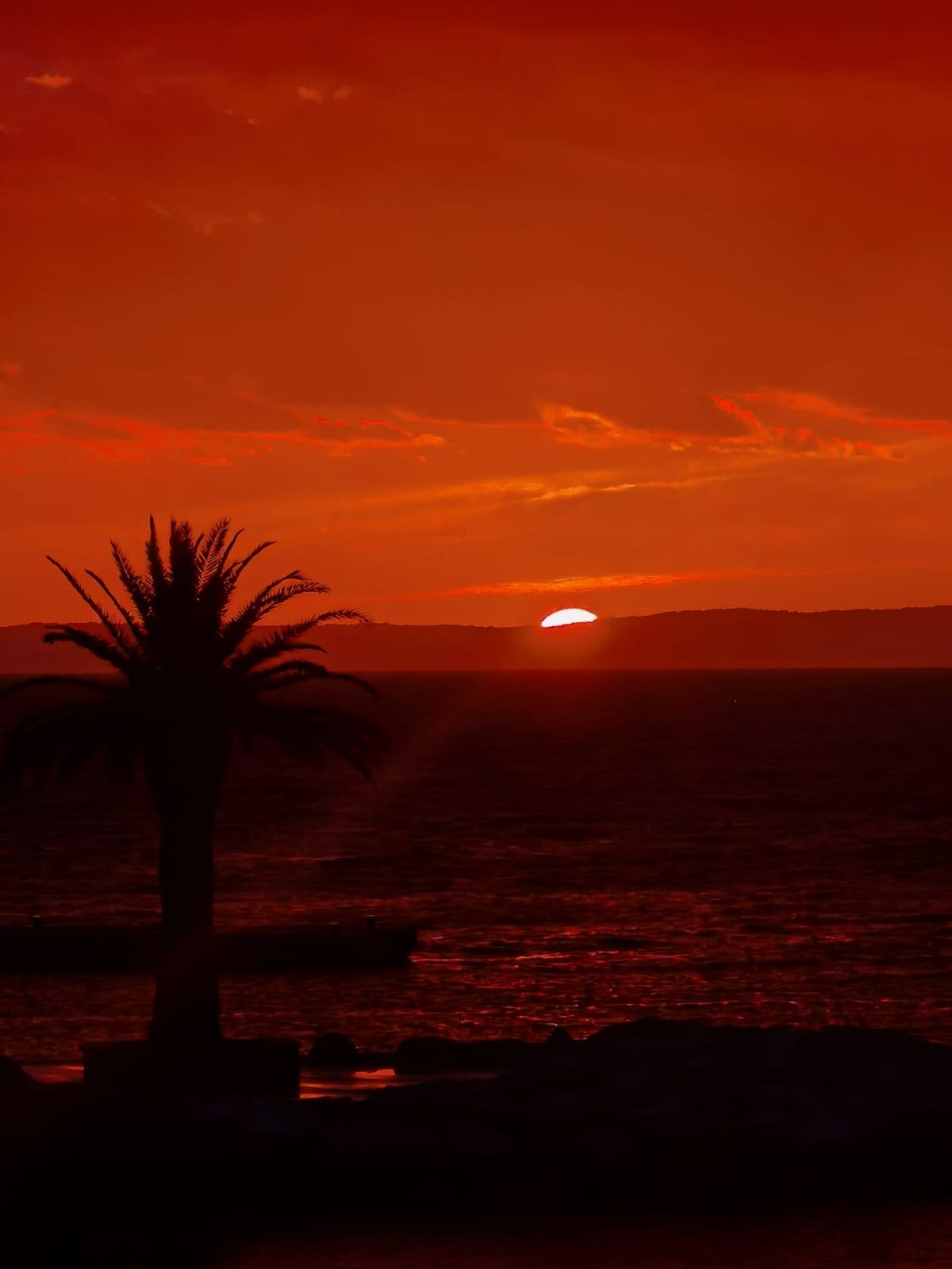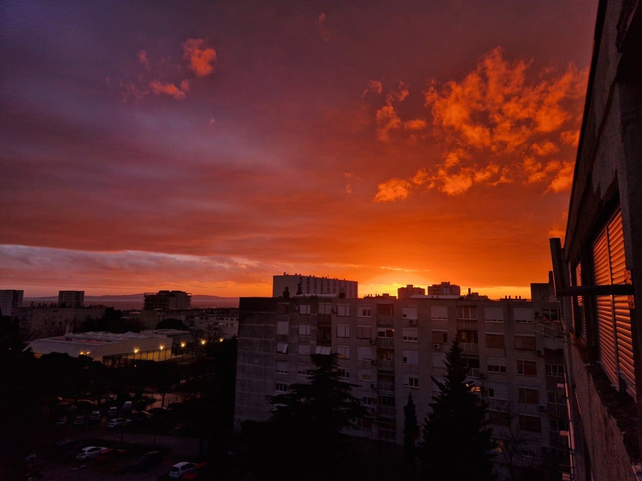 Kraj dana obilježio je lijep zalazak sunca koji je osobito na splitskom području intenzivno crvene boje. Naoblaka je napukla na krajnjem zapadu pa su zrake sunca obojile grad, otoke, Mosor.
