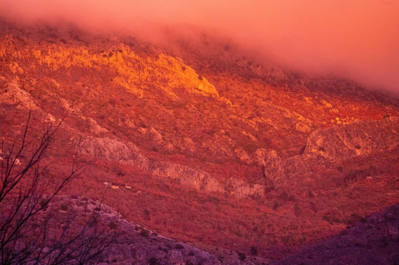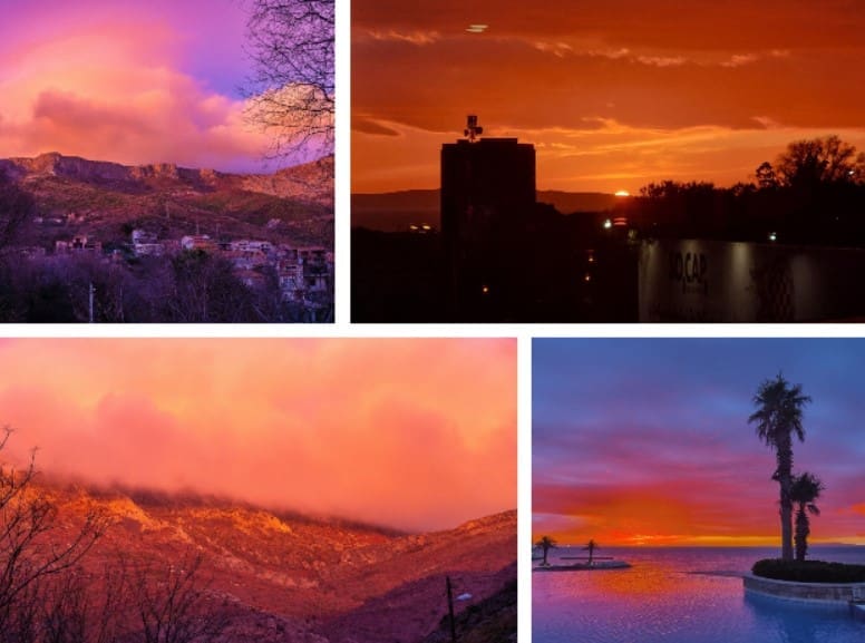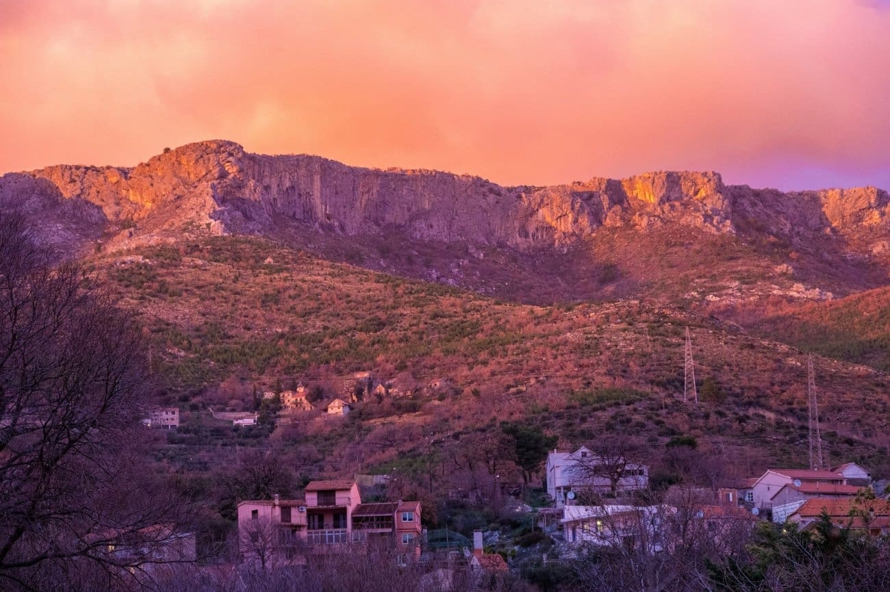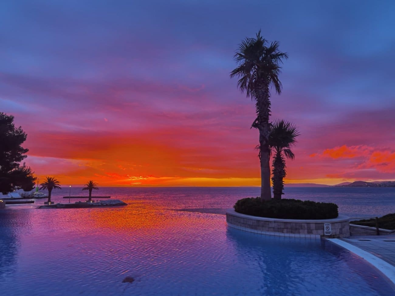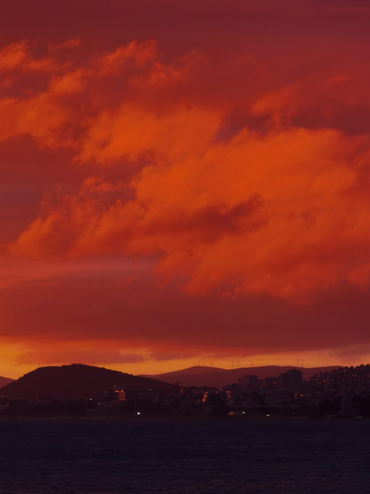 Kraj dana obilježio je lijep zalazak sunca koji je osobito na splitskom području intenzivno crvene boje. Naoblaka je napukla na krajnjem zapadu pa su zrake sunca obojile grad, otoke, Mosor.
