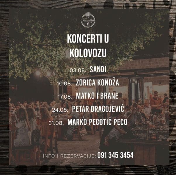 Osim Zorice Kondže, Familija je za 8. mjesec pripremila niz vrhunskih nastupa uživo srijedom od kojih je prvi na redu koncert Sandija Cenova koji nas očekuje već sutra 3.8. s početkom u 20:00 sati. Srijeda 17.8. je rezervirana za duo Matko i Brane, tjedan iza za Petra Dragojevića, a posljednja srijeda u kolovozu za Marka Pecotića Pecu. Cijena ulaznice za ove koncerte je 200 kn po osobi (osim koncerta Zorice Kondže 250 kn po osobi) i u nju su uključeni hladno predjelo i mesna plata.
