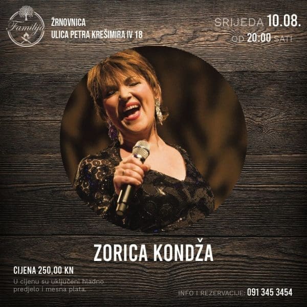 Nastup Zorice Kondže u restoranu Familija u Žrnovnici će se održati 10.8. od 20:00 sati, a kako bi publika u potpunosti mogla uživati restoran je pripremio poseban jelovnik koji uključuje hladno predjelo i mesnu platu po cijeni od 250 kuna po osobi.