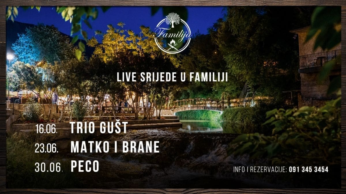 Srijeda u Familije već tradicionalno postaje dan za nastupe uživo. Nakon izvrsnog otvaranja ljetne sezone nastupom Marka Pecotića Pece, restoran je nastavio u zabavnom ritmu. Dosadašnji eventi u Familiji su se pokazali kao pun pogodak i za svaki se tražilo mjesto više. U sljedećim tjednima nas očekuju novi koncerti pa smo u razgovoru s vlasnikom restorana Darkom Slivarom, doznali njihov raspored za ostatak lipnja.