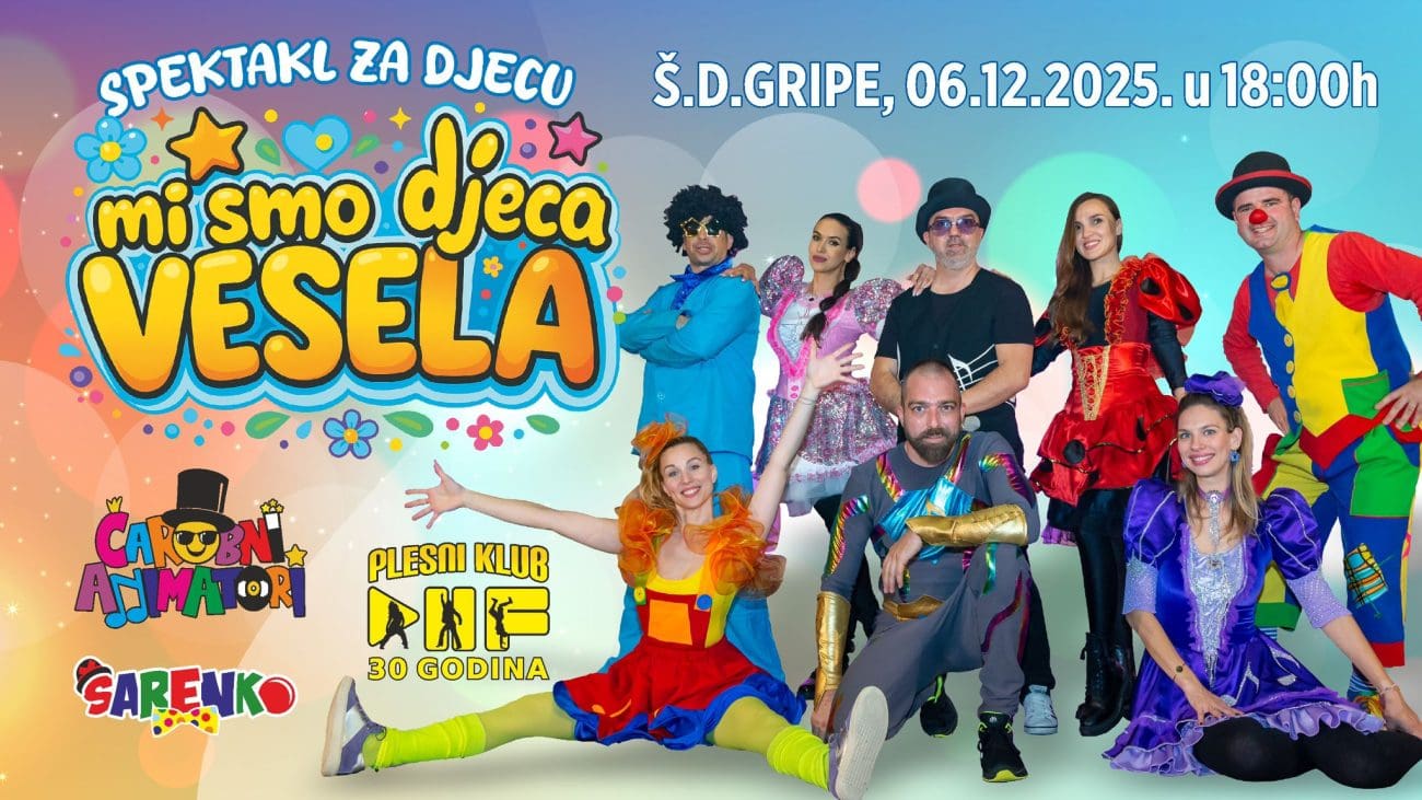 Projekt „Mi smo djeca vesela“ donosi veliki glazbeno-plesni spektakl za djecu i cijelu obitelj povodom 30. obljetnice Plesnog kluba D’N’F. Ovaj spektakl će se održati u subotu, 6. prosinca, u velikoj dvorani Gripe u Splitu s početkom u 18 sati.