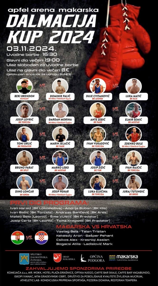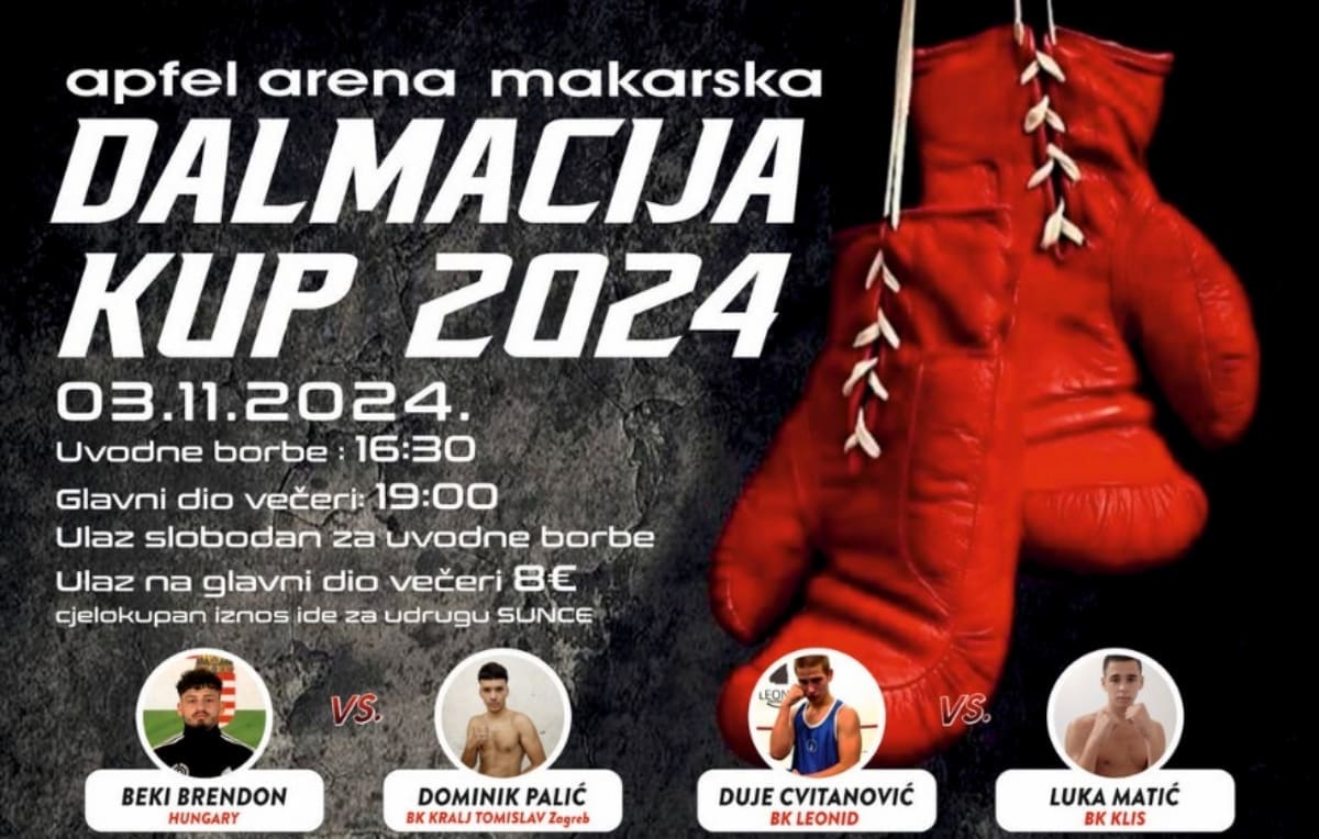 Makarska će 3. studenog 2024. biti domaćin drugog izdanja prestižnog boksačkog turnira "Dalmacija Kup", koji će se održati u Apfel Areni na adresi Volicija 5, s početkom u 17:00 sati. Ljubitelji borilačkih sportova mogu očekivati večer ispunjenu adrenalinom, uzbudljivim borbama i nastupima vrhunskih boksača iz regije.
