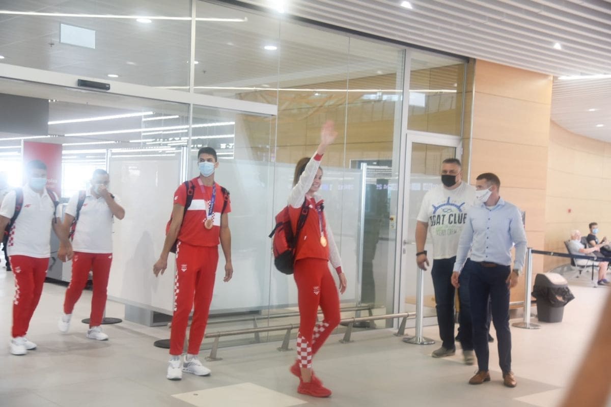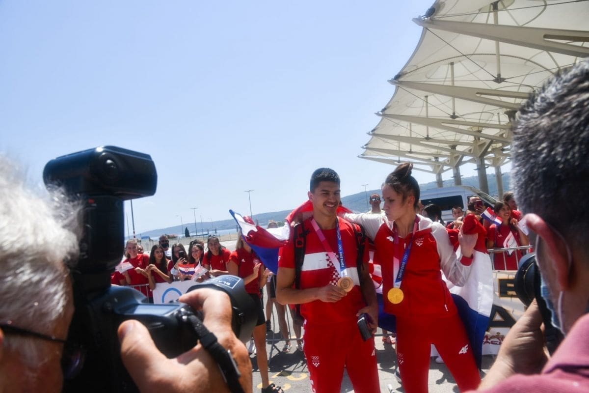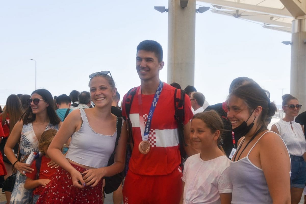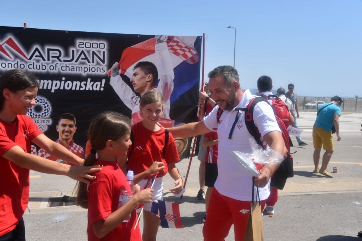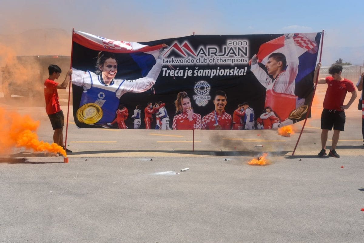 Špalir za medaljaše iz Tokija priredili su kolege iz kluba Marjan na izlazu iz zračne luke u Kaštelima uz gromoglasan pljesak, baklje, hrvatsku zastavu i povike 'Šampioni!'. Dijelili su autograme i brošure, a pala je i koja suza radosnica.
