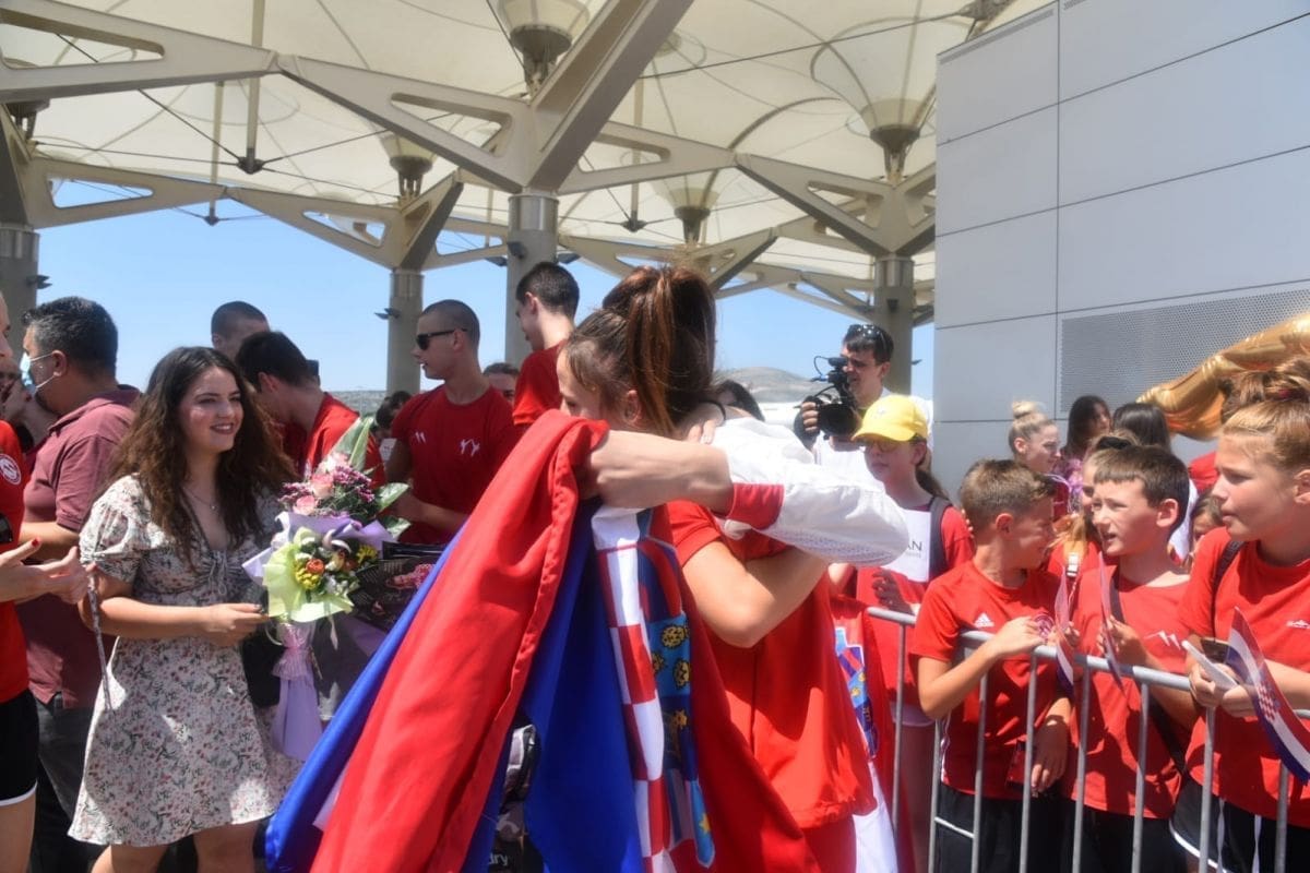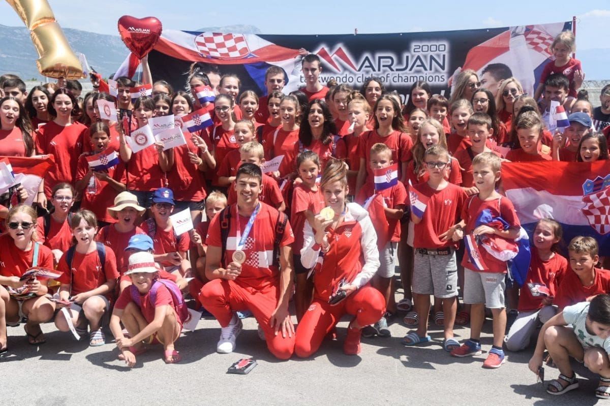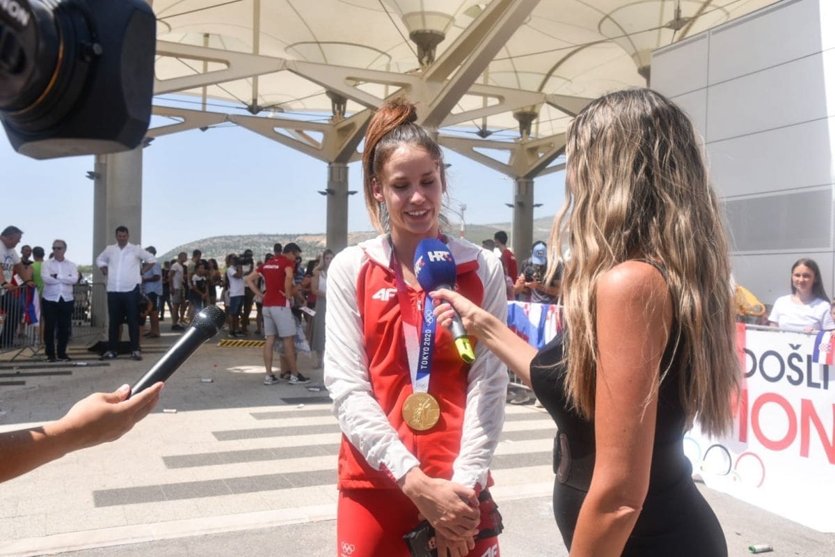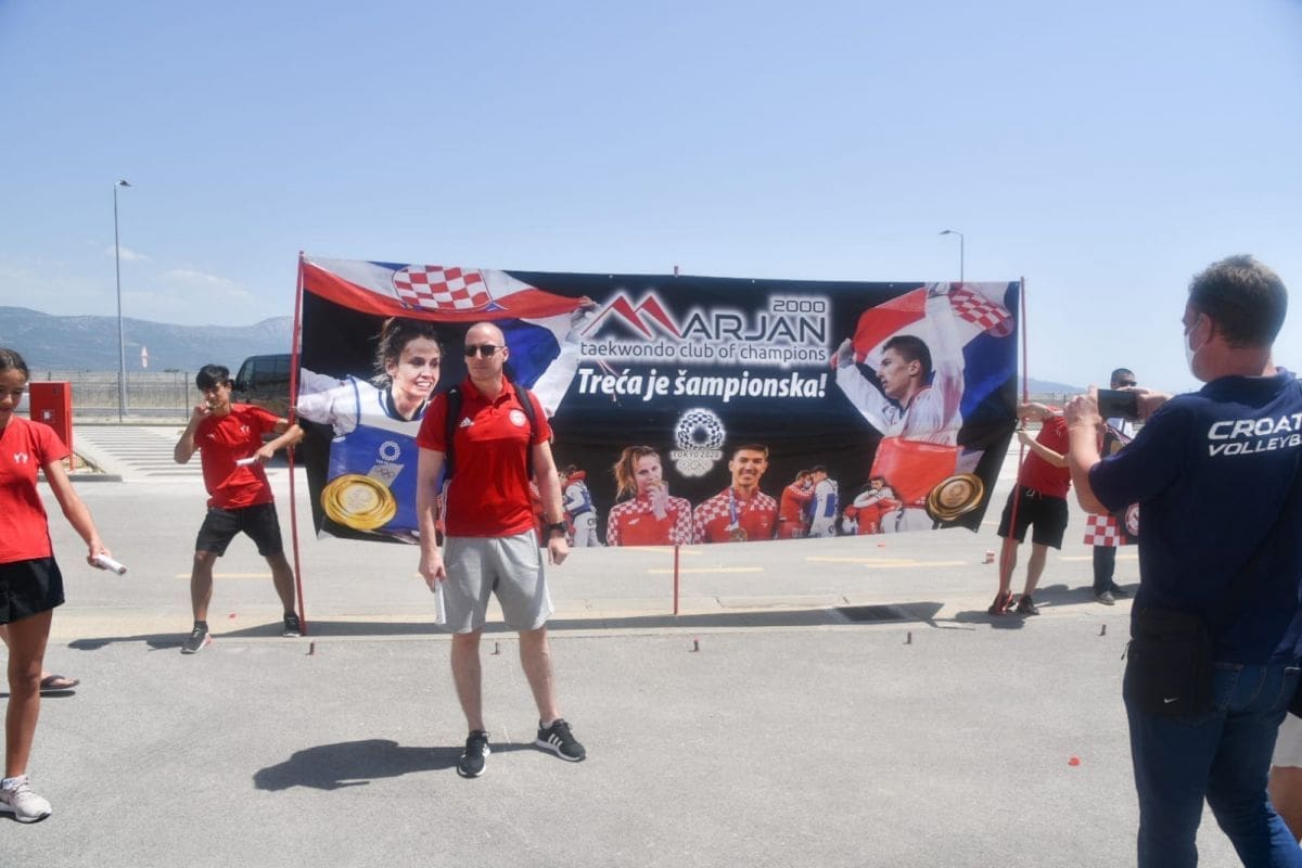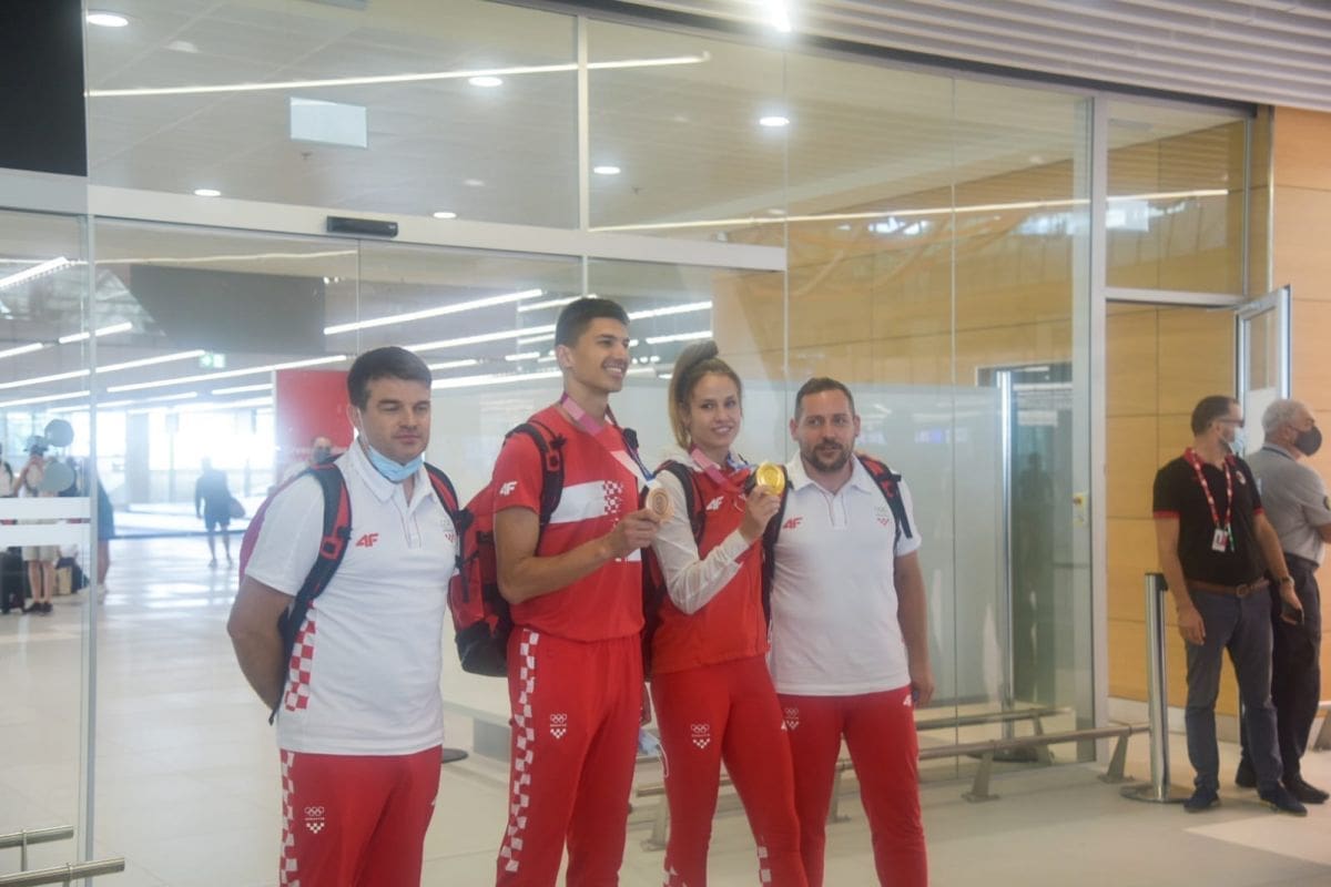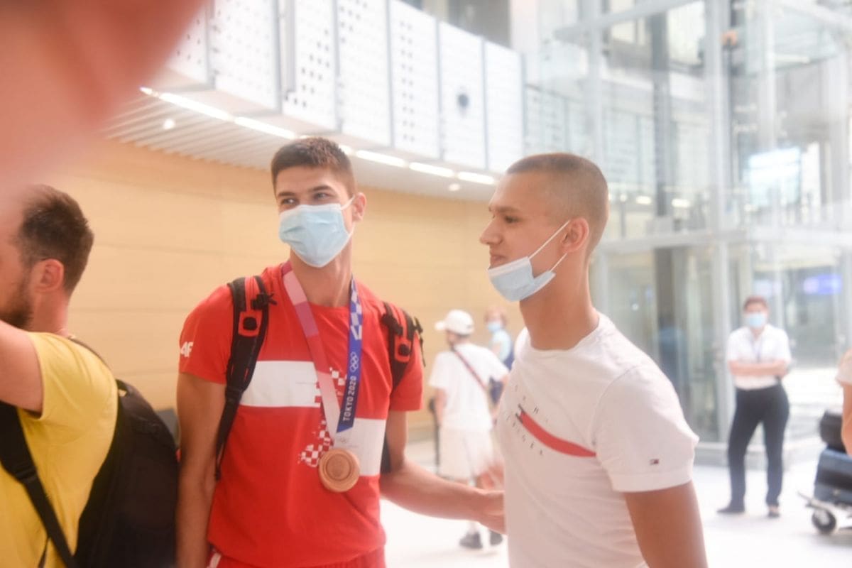 Špalir za medaljaše iz Tokija priredili su kolege iz kluba Marjan na izlazu iz zračne luke u Kaštelima uz gromoglasan pljesak, baklje, hrvatsku zastavu i povike 'Šampioni!'. Dijelili su autograme i brošure, a pala je i koja suza radosnica.