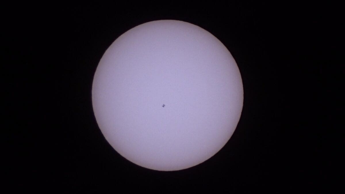Međunarodna svemirska postaja razvijena je istraživačka postaja sa pet članova koja rotira oko Zemlje brzinom 27.600 km/h (12.338 m/s) te je okruži dnevno 15.7 puta, odnosno svake 92 minute pa je za ovakve snimke potrebno mnogo iskustva budući da se postaja ispred Sunca nađe 1-5 sekundi dnevno.