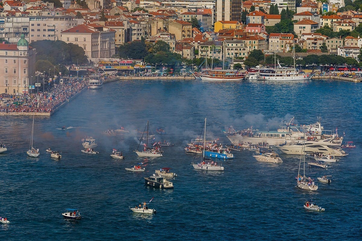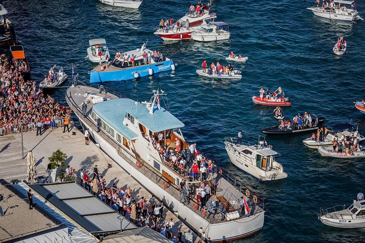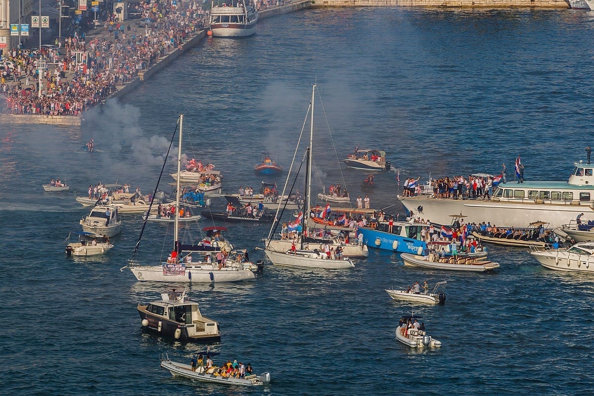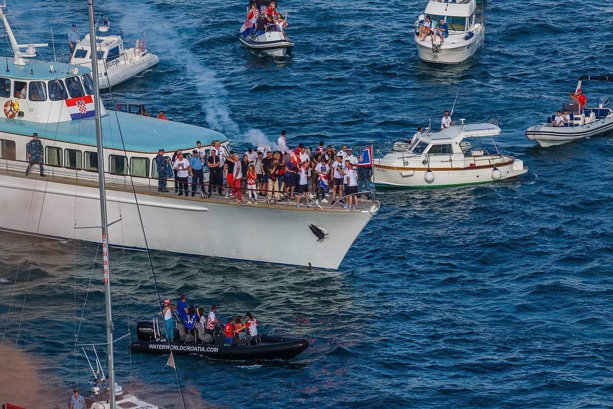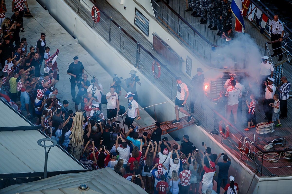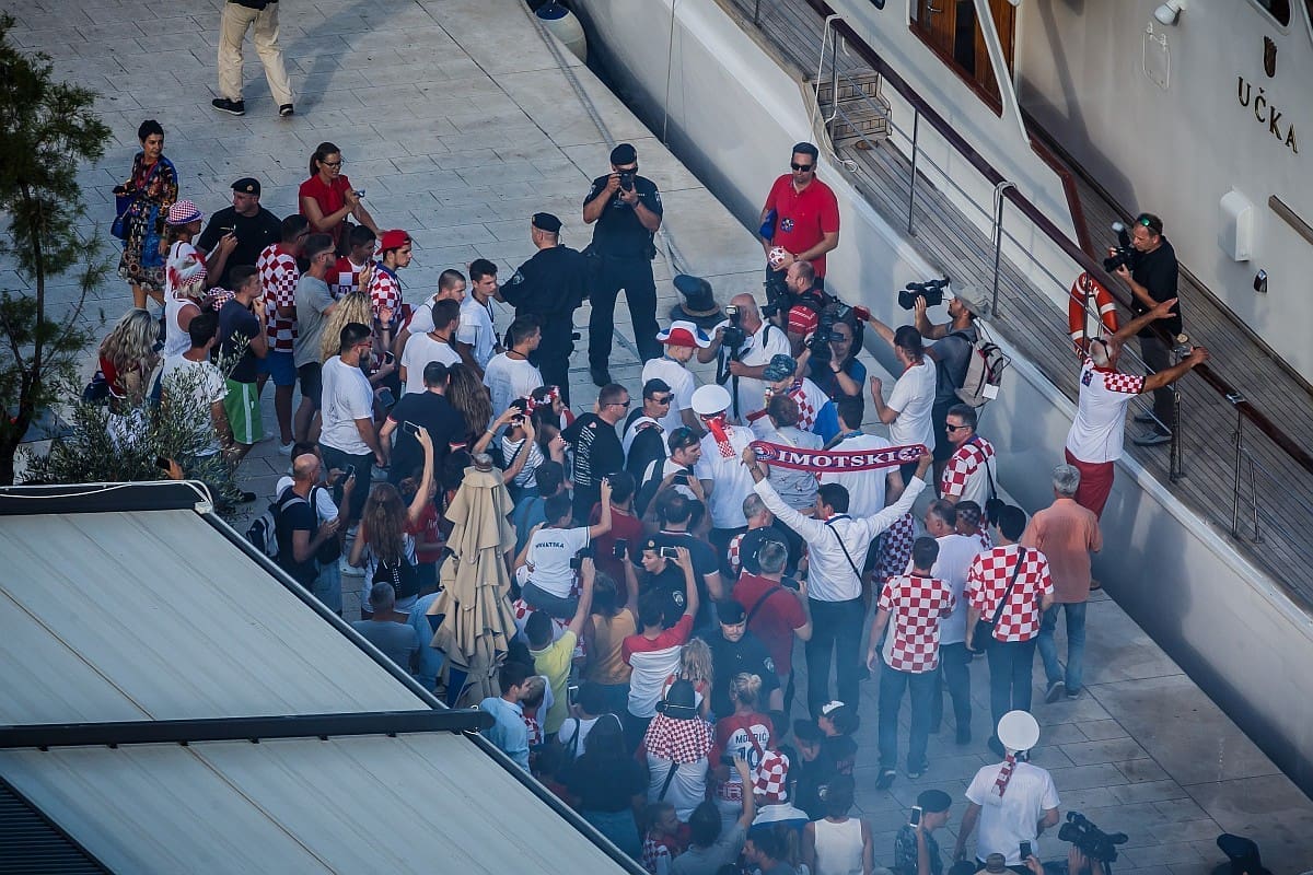 Deseci tisuća ljudi iz cijele Dalmacije i susjedne Hercegovine stiglo je u utorak poslijepodne u Split na doček koji je u čast Vatrenih organiziran na Rivi. Vatreni su stigli morem, na jahti Učka Hrvatske ratne mornarice.