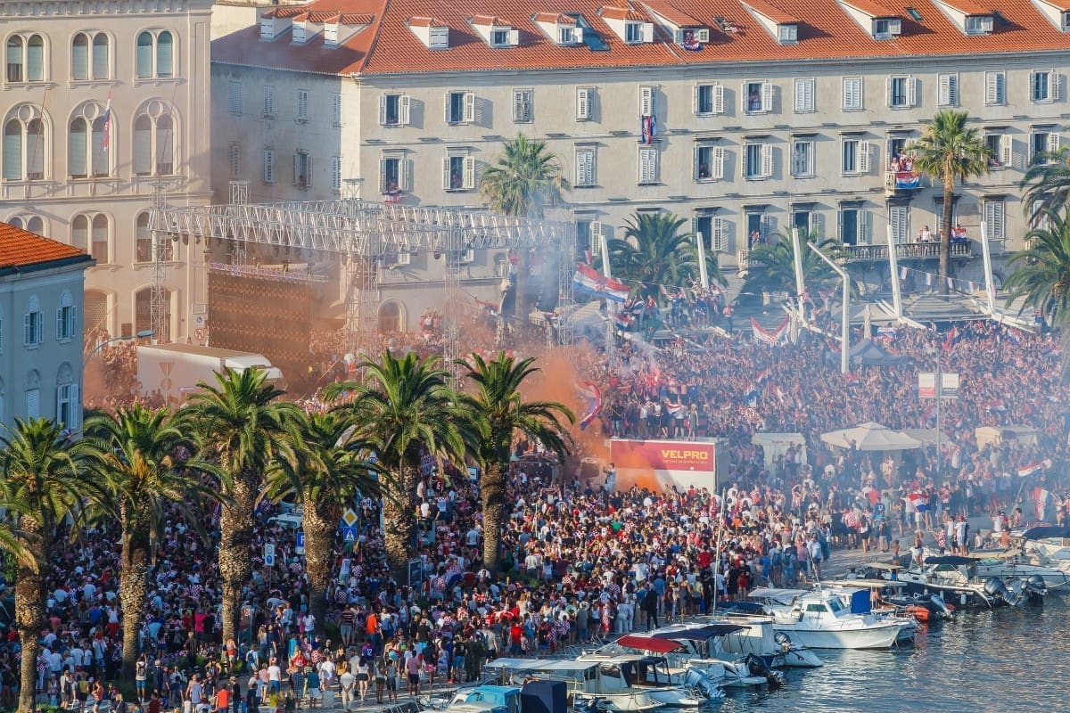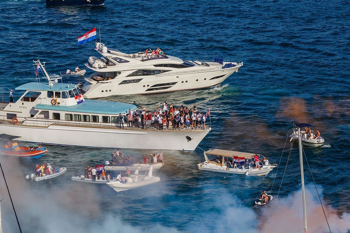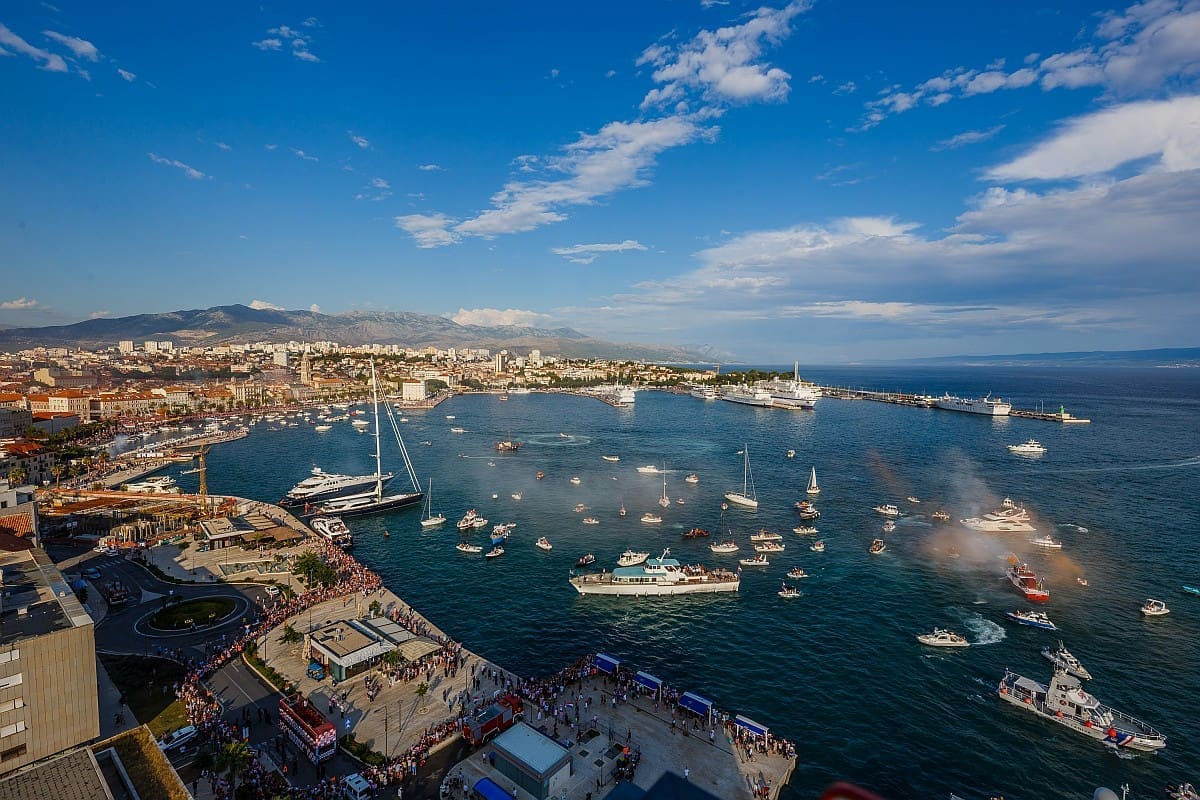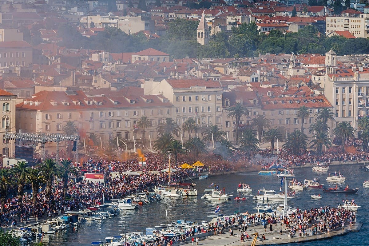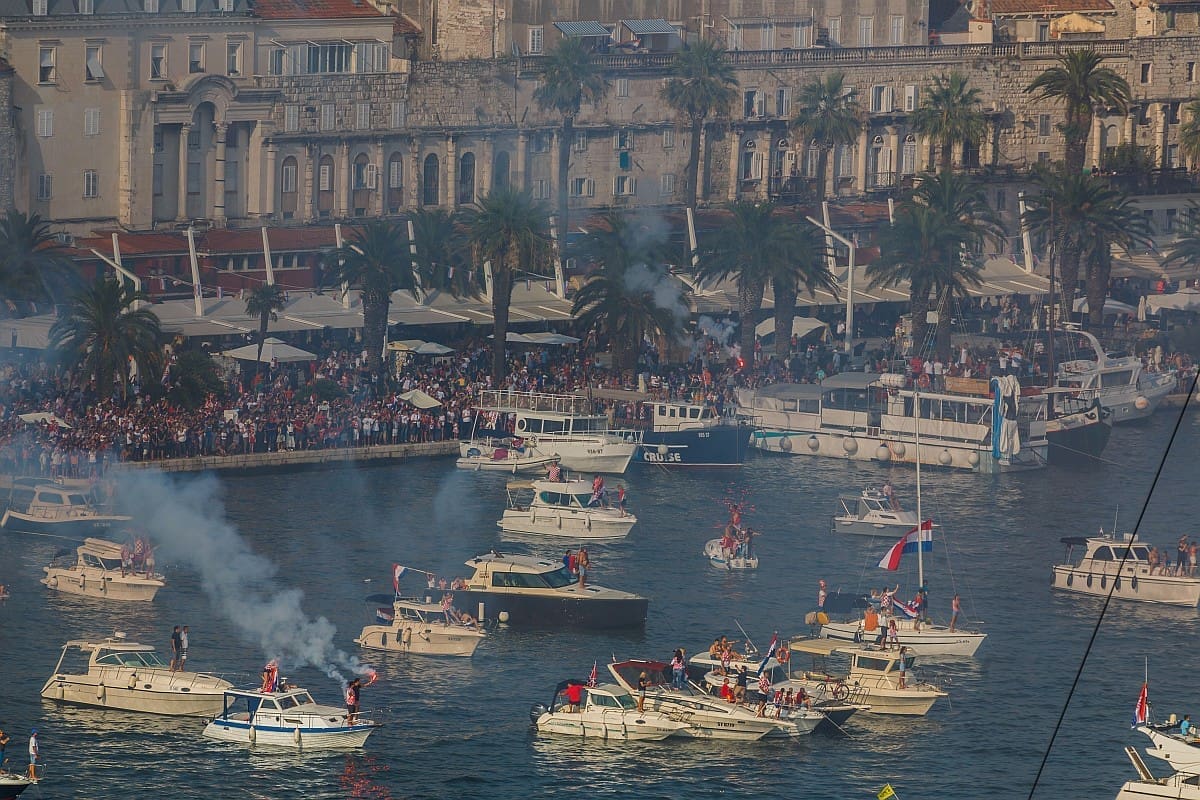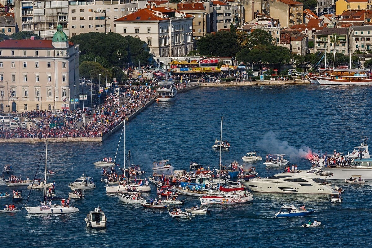 Deseci tisuća ljudi iz cijele Dalmacije i susjedne Hercegovine stiglo je u utorak poslijepodne u Split na doček koji je u čast Vatrenih organiziran na Rivi. Vatreni su stigli morem, na jahti Učka Hrvatske ratne mornarice.