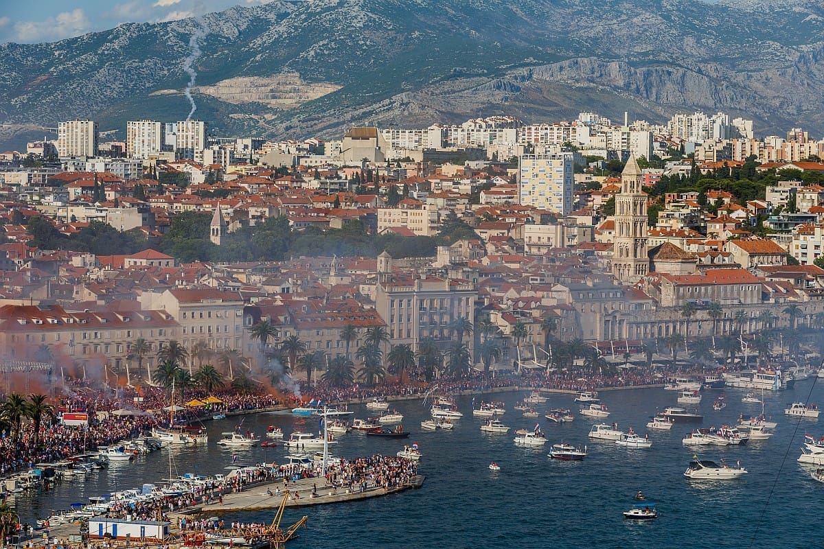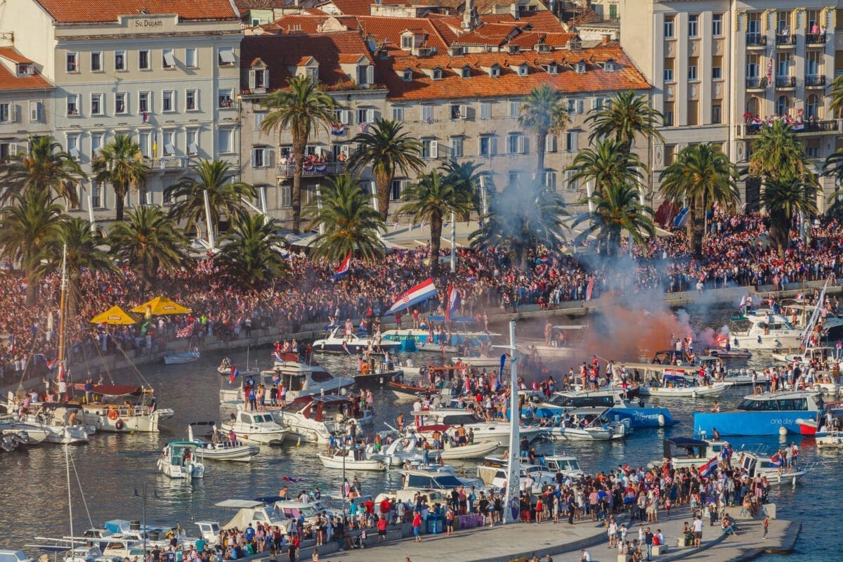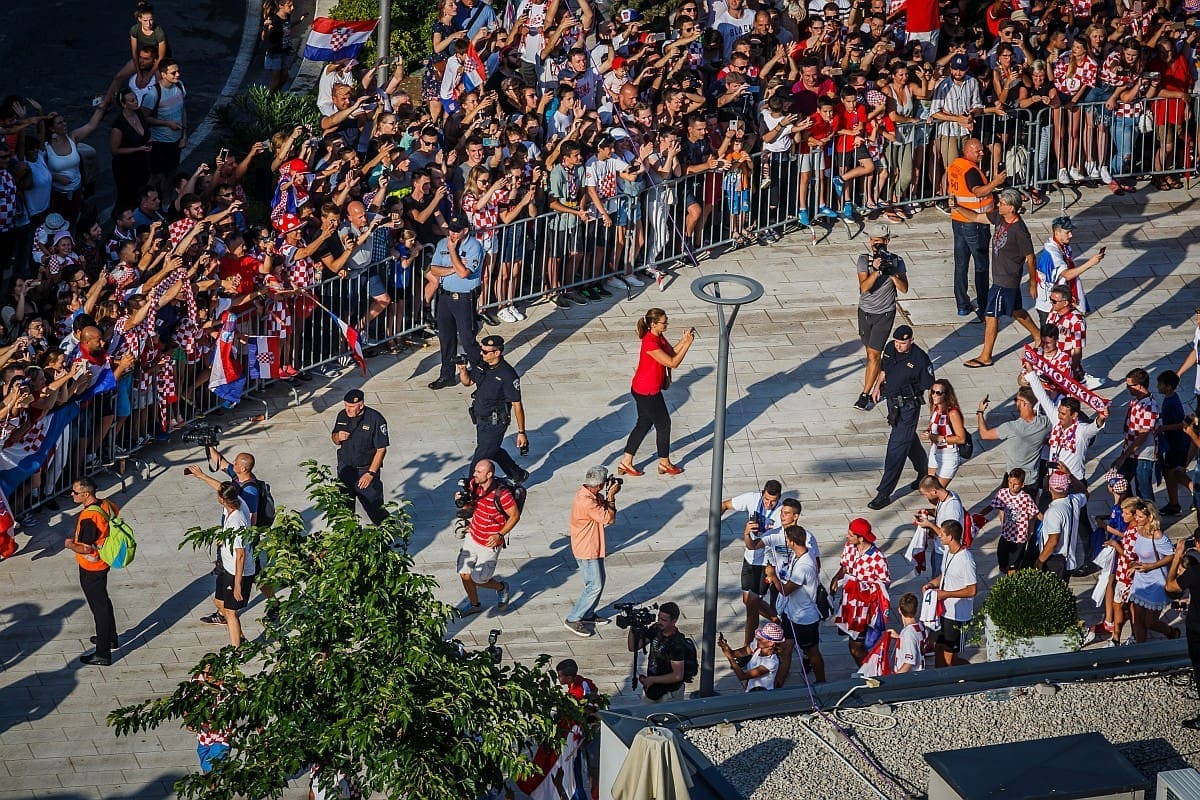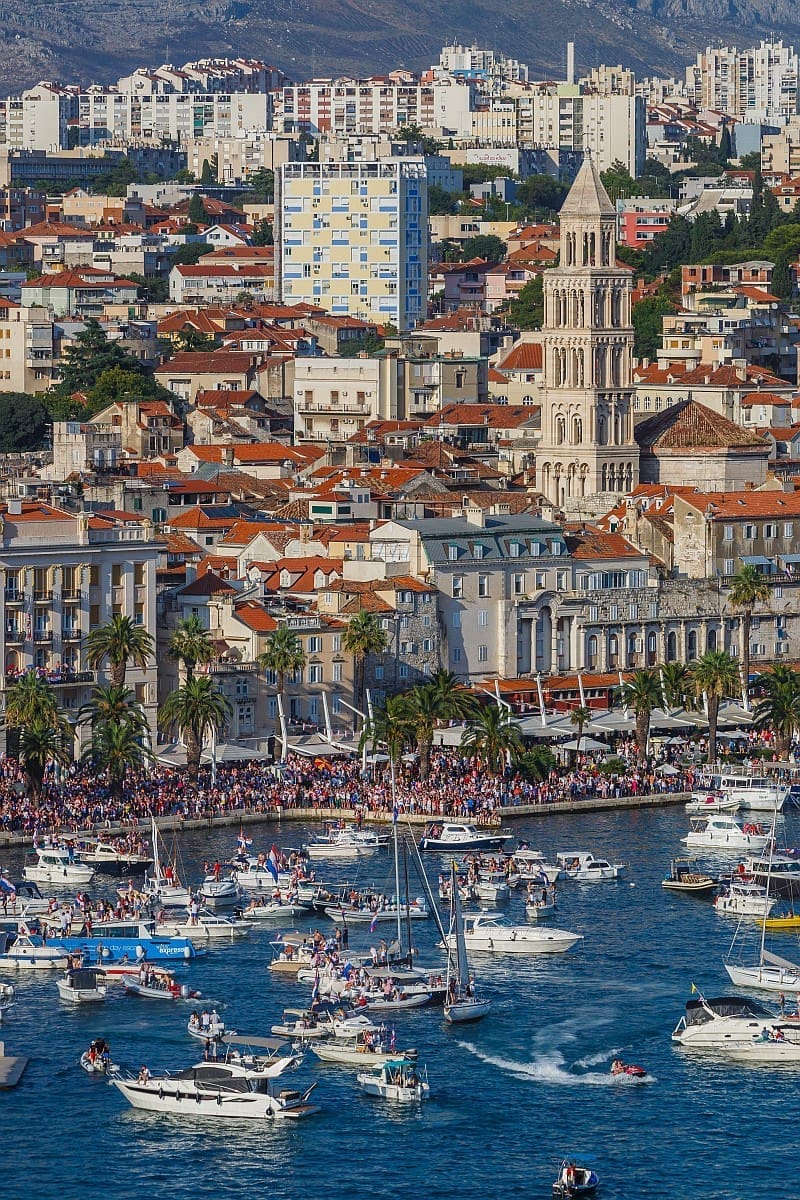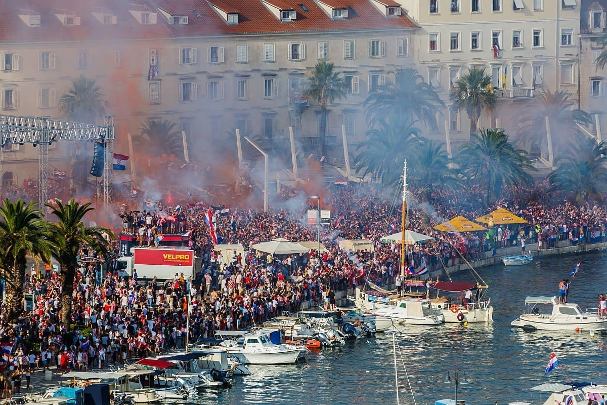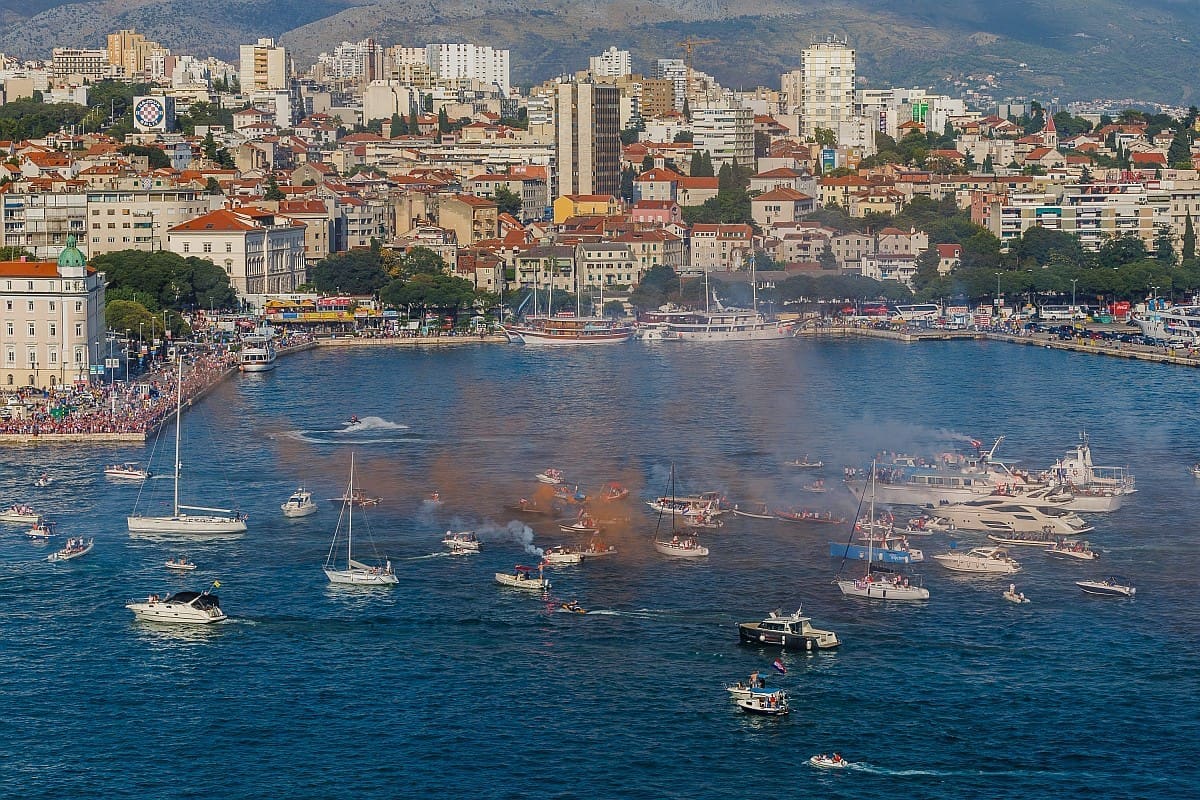 Deseci tisuća ljudi iz cijele Dalmacije i susjedne Hercegovine stiglo je u utorak poslijepodne u Split na doček koji je u čast Vatrenih organiziran na Rivi. Vatreni su stigli morem, na jahti Učka Hrvatske ratne mornarice.