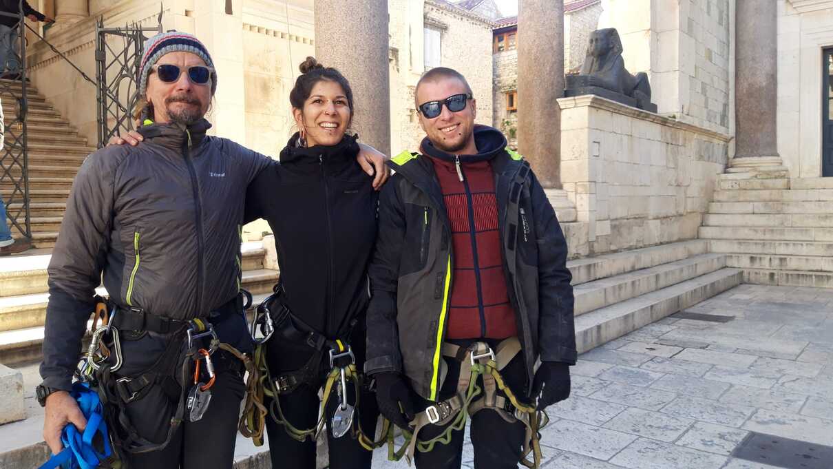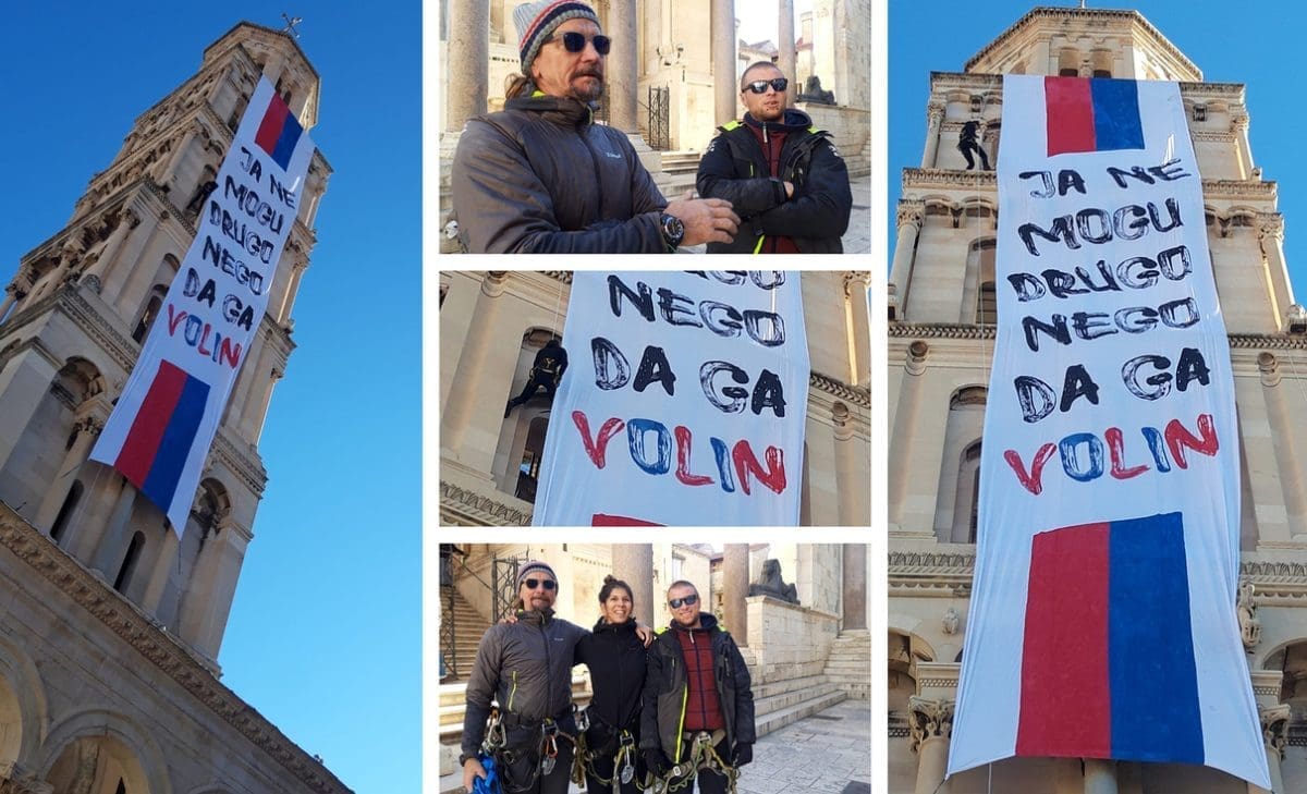 Djelatnici penjači specijalne 'Techno Alp' tvrtke Ivica Matković, Toni Pranić i Zrinka Grubišić postavili su ovaj veliki transparent na Svetog Duju.