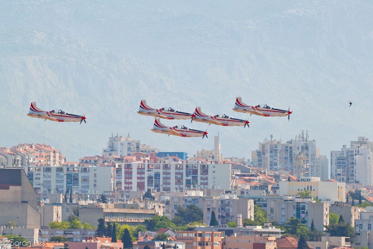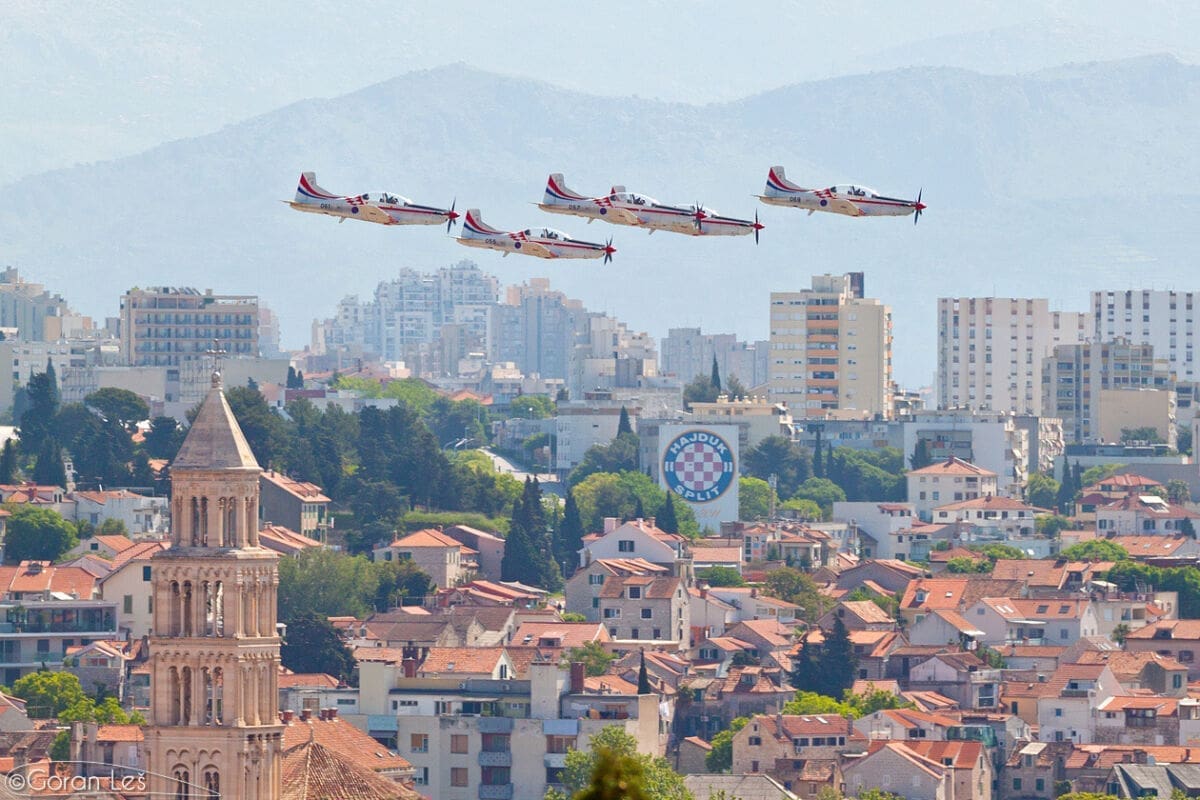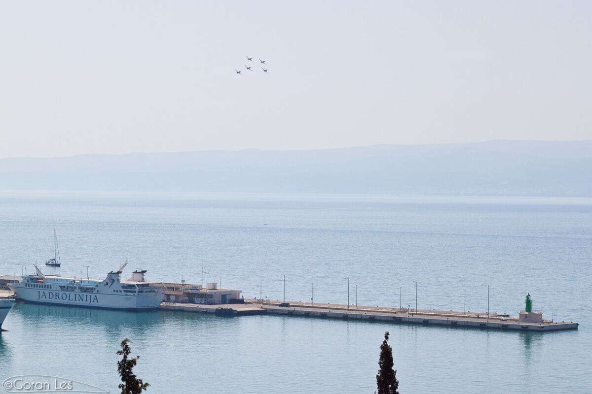 Splitski fotograf Goran Leš popeo se na Marjan kako bi dobio savršen pogled na akrobacije letačke skupine "Krila Oluje" te je također uspio uhvatiti i njihov prelet preko zvonika Sv. Duje, koji najavljuje i skorašnje slavlje zaštitnika grada Splita.