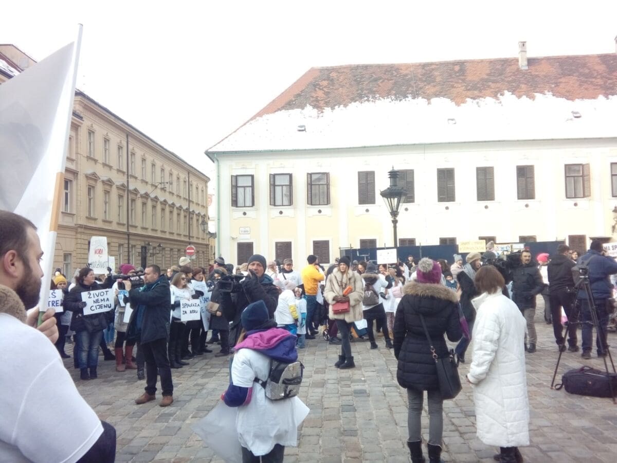 Danas se na Markovu trgu održao prosvjed "Spinraza za sve". Iz Omiša su krenula četiri autobusa i kombi puni prosvjednika. Među njima je bila i mala Nora kojoj nije odobren lijek Spinraza te njena majka Marina Bartulović Rogošić.