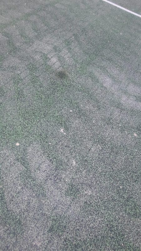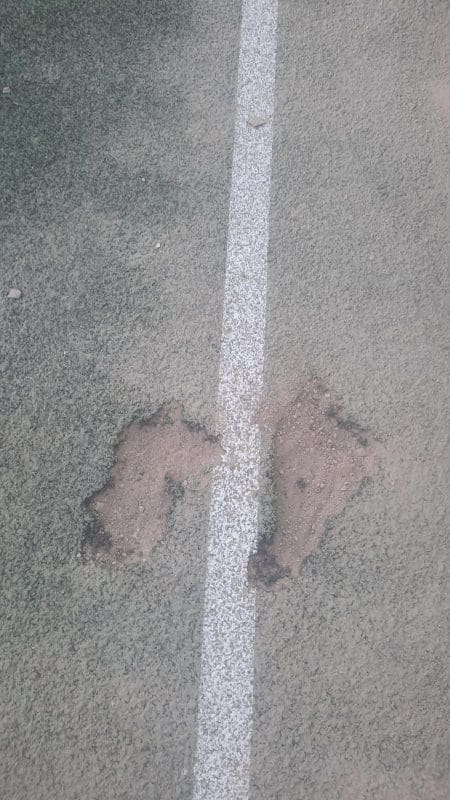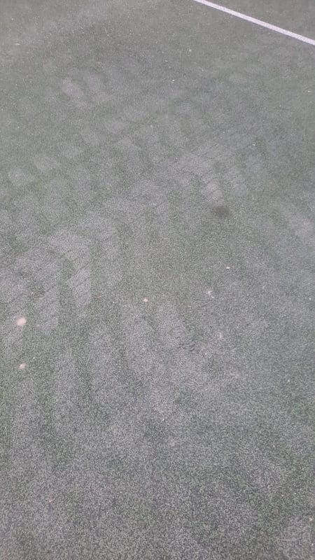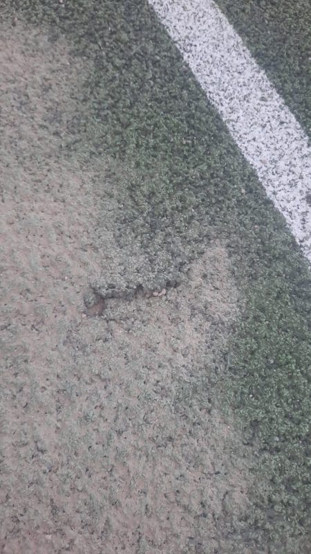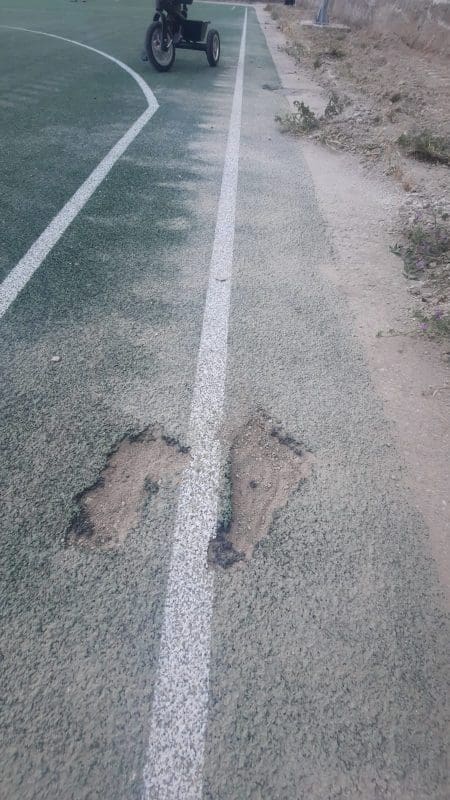 Kako su na podlozi vidljivi tragovi prolaska građevinske mehanizacije koja se početkom sedmice ušetala u igralište Osnovne škole Spinut i u 7 i 30 započela s pilanjem betona, prilično je vjerojatno da su oštećenja nastala od izvođača radova s nalogom uređenja drugog dijela igrališta.
