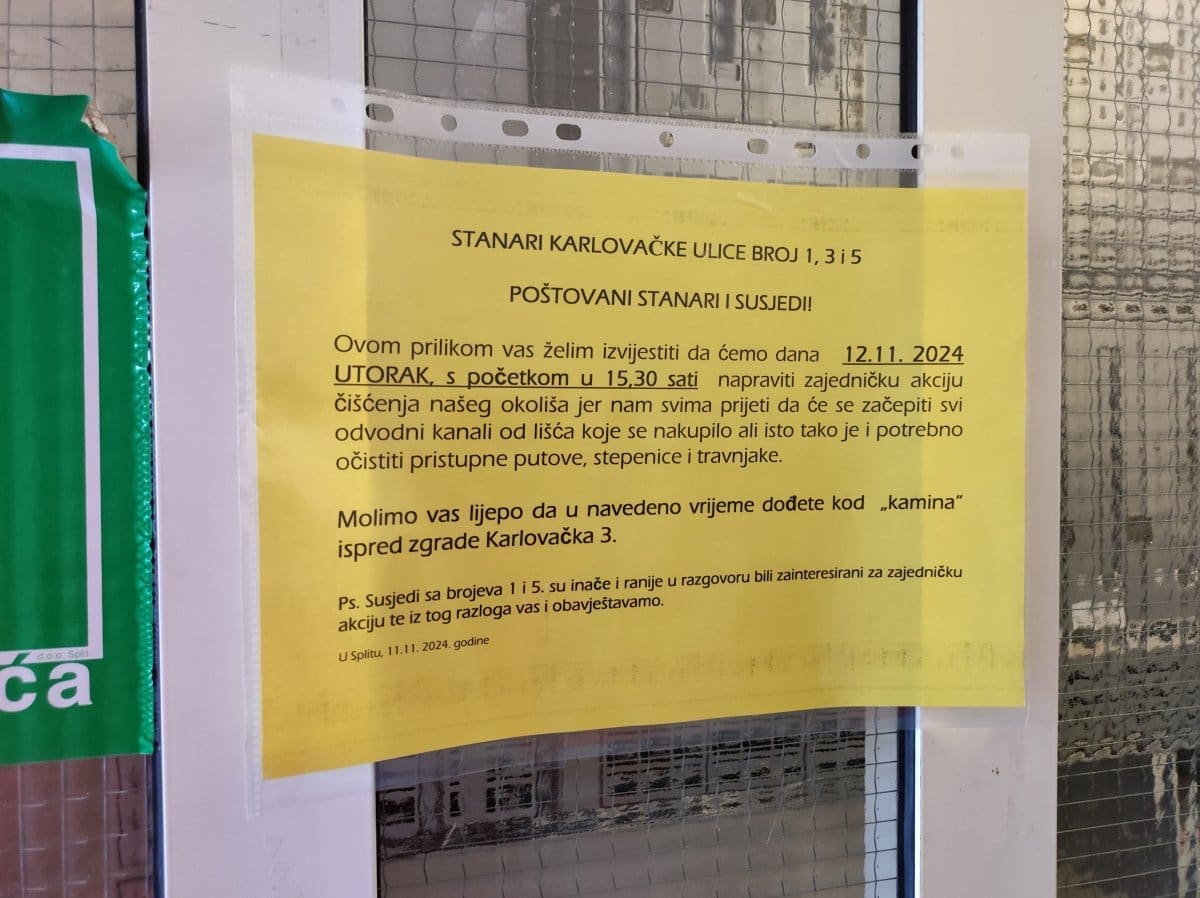 Stanari zgrada u Karlovačkoj ulici 1, 3 i 5 održali su danas zajedničku akciju čišćenja okoliša ispred svojih zgrada. Cilj akcije je očistiti odvodne kanale od nakupljenog lišća kako bi se izbjeglo njihovo začepljenje, ali i osigurati da su pristupni putovi, stepenice i travnjaci uredni i sigurni za sve stanare.