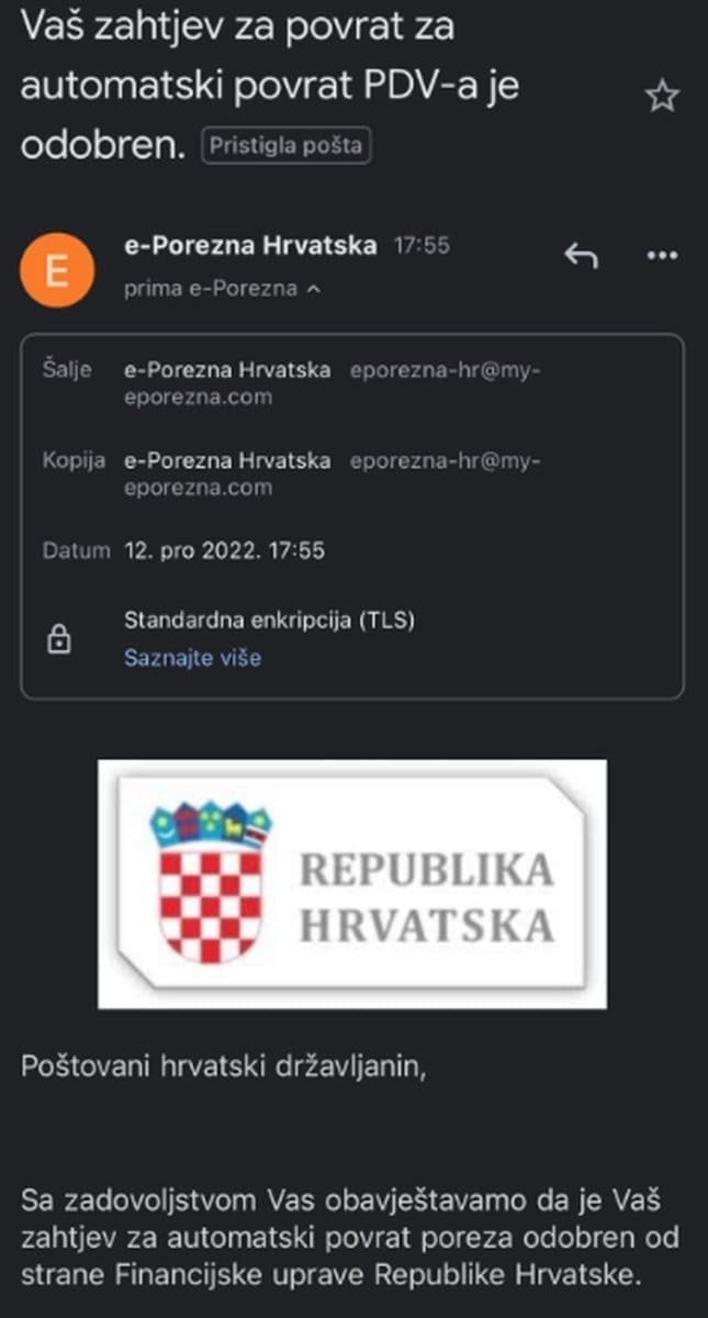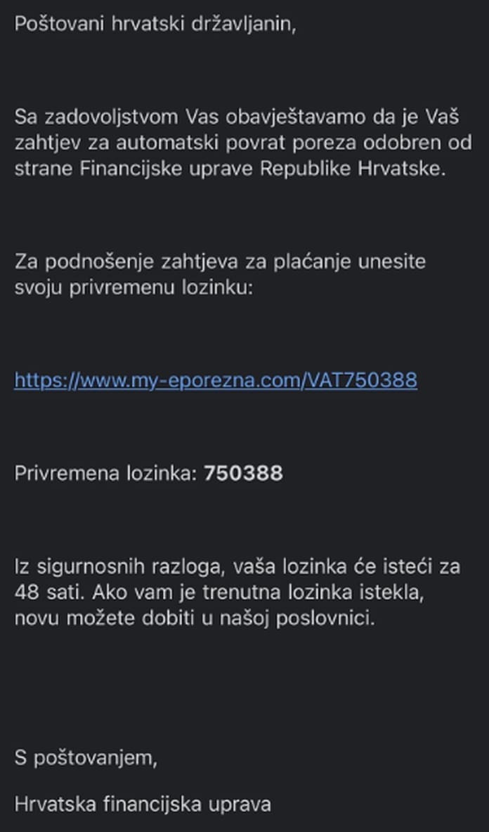 Naime, kako su javili, riječ je o poruci koja dolazi od pošiljatelja potpisanog kao "e-Porezna Hrvatska". U mailu je vidljivo da je riječ o lažnoj poruci kojom se očito želi prevariti građane i brojne hrvatske državljane.