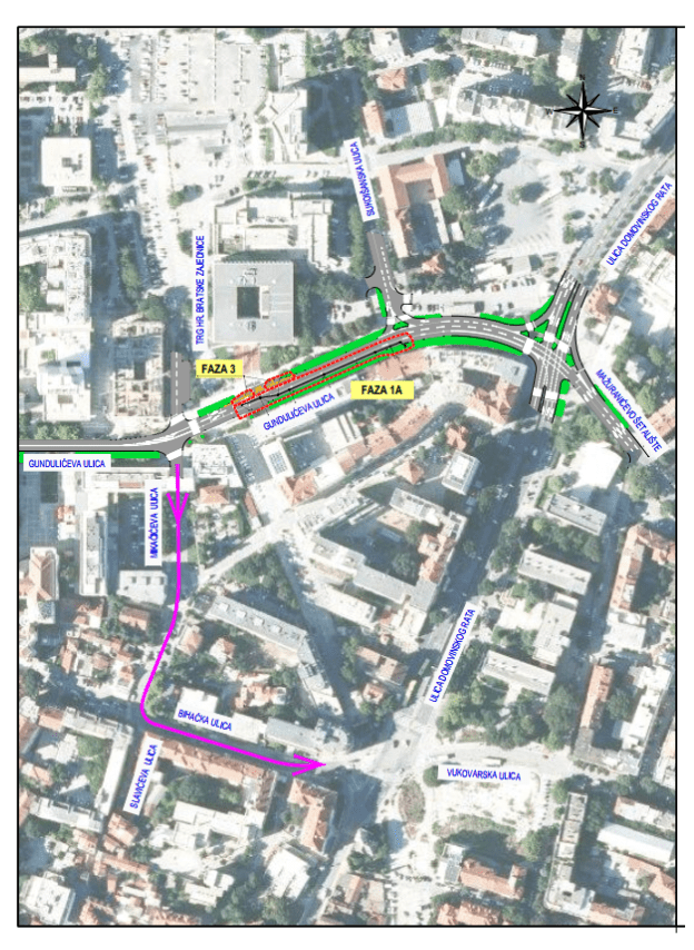 Tijekom izvođenja radova u fazi 1A promet iz smjera zapada prema istoku se preusmjerava na obilazni put na ulicu Dujma Mikačića i Bihačku ulicu zbog nesmetanog prometa dužih vozila predviđeno je uklanjanje postojeća tri parking mjesta uz caffe Modesti. Za potrebe javnog autobusnog prijevoza uređuje se privremena autobusna stanica uz adresu Bihačka br. 29.