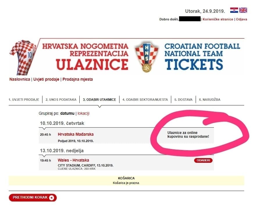- Danas sam za obitelj išao online kupiti 4 ulaznice. Informatički sam potkovan, a više od 2 i pol sata nisam uspio ništa kupiti. Prvo sam pokušao kupiti 4, pa ih nije bilo u nizu, pa sam pokušao kupiti 3, pa 2, pa samo jednu. No na desetke puta mi je izbacivalo "error" i u konačnici sam odustao. Greška koja se javlja kad završim kupovinu i odaberem samo jednu kartu za sebe - kaže naš čitatelj.