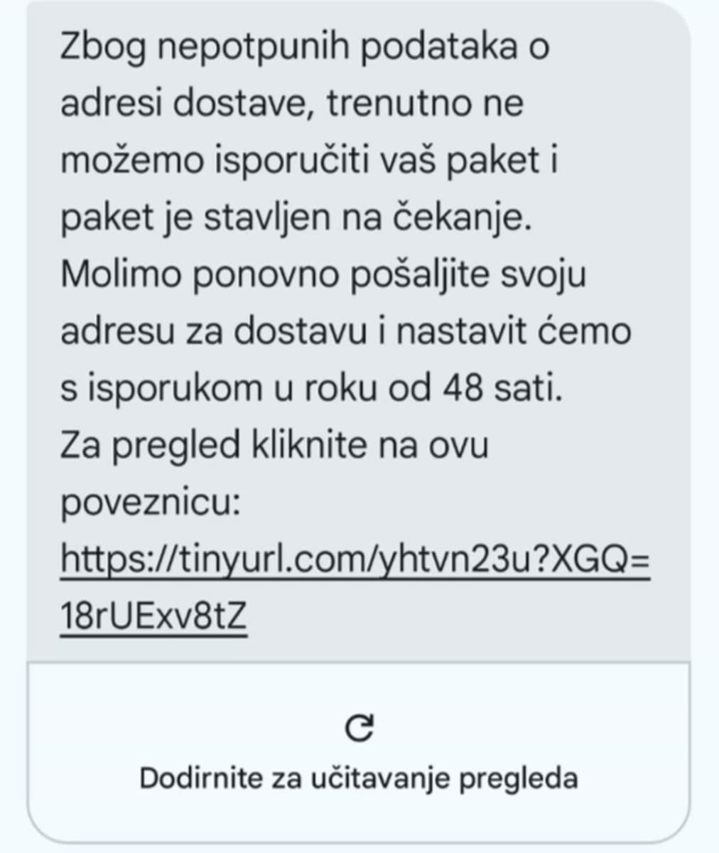 Prema dosadašnjim informacijama, ovakve poruke često koriste taktiku hitnosti, tražeći od primatelja da kliknu na link kako bi navodno ažurirali podatke o dostavi ili platili dodatne troškove. Međutim, klikom na link građani riskiraju gubitak novca ili zloupotrebu osobnih podataka.