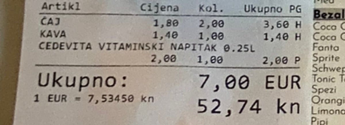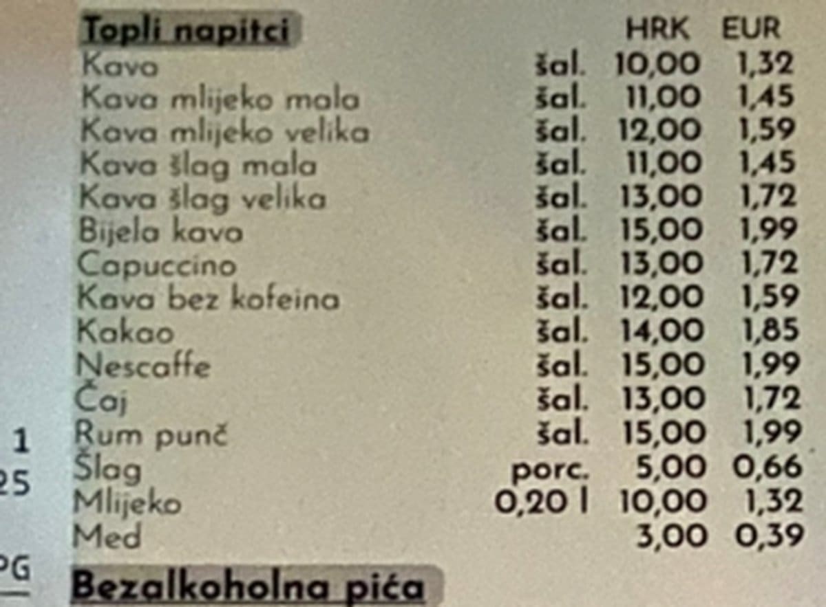 No, koliko je u ovom ima istine najbolje govori primjer iz jednog splitskog kafića. Naime, čitatelj kaže da nisu iste cijene na računu i na cjenicima, a to je potkrijepio 'dokaznim materijalom', odnosno fotografijom.