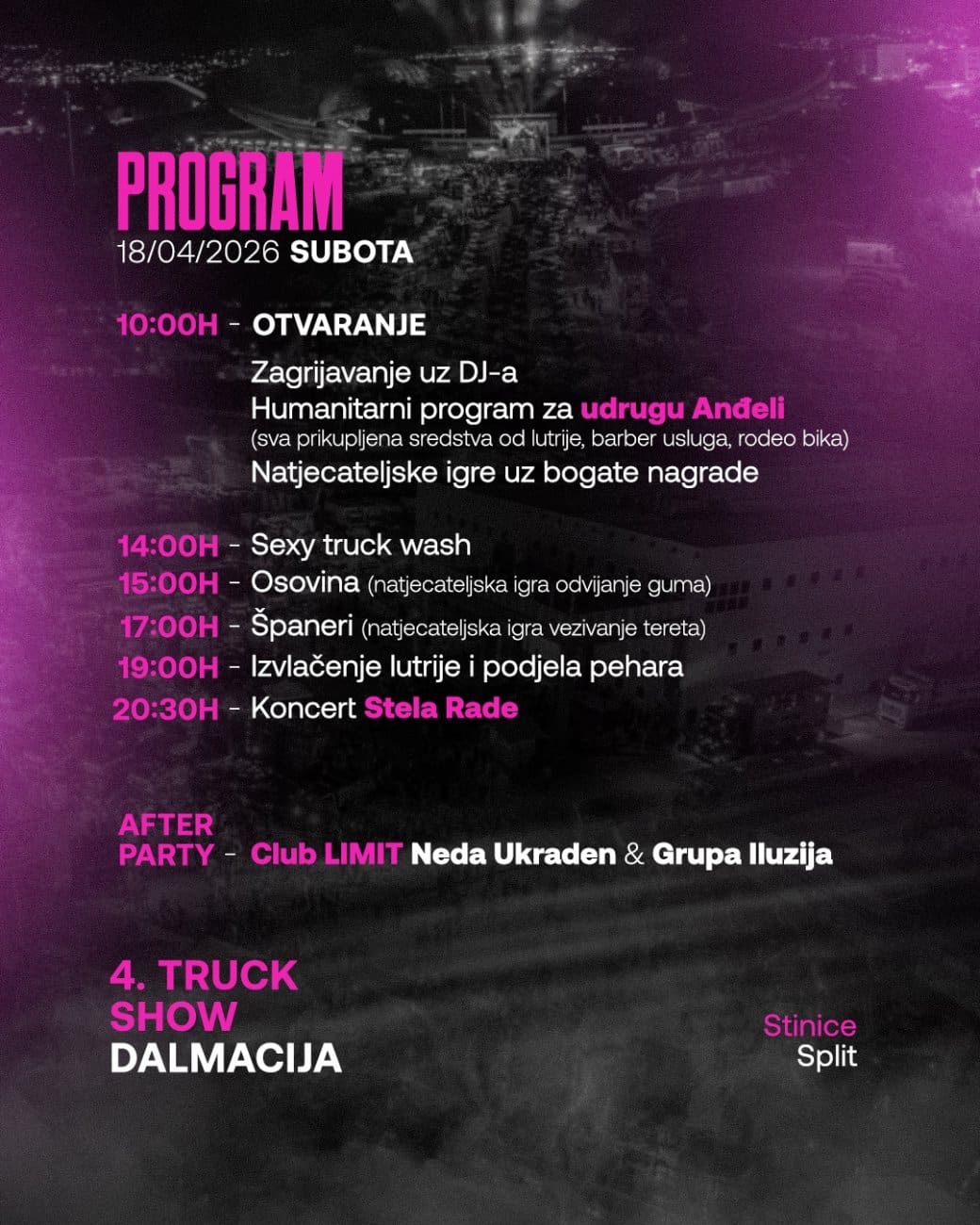 Danas slijedi vrhunac manifestacije stoga smo kontaktirali organizatora događaja Stipu Budišu. Večeras se očekuje i najveća posjećenost, a uz Stelu Rade atmosferu će dodatno zagrijati i bogat zabavni program. Iz organizacije poručuju kako je sve spremno za završnicu ovogodišnjeg Truck Showa Dalmacija.
