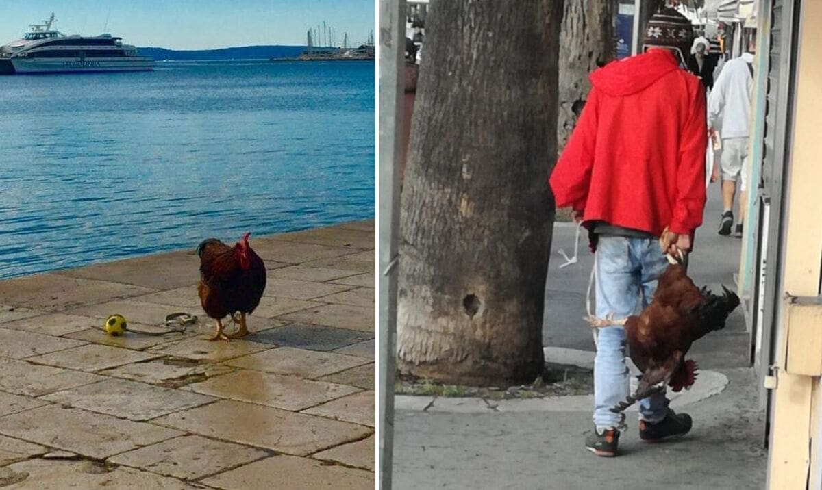 Više nego neuobičajenom prizoru Splićani su svjedočili na Rivi u četvrtak ujutro. Sredovječni muškarac prošetao je pijetla uzduž cijele Rive!