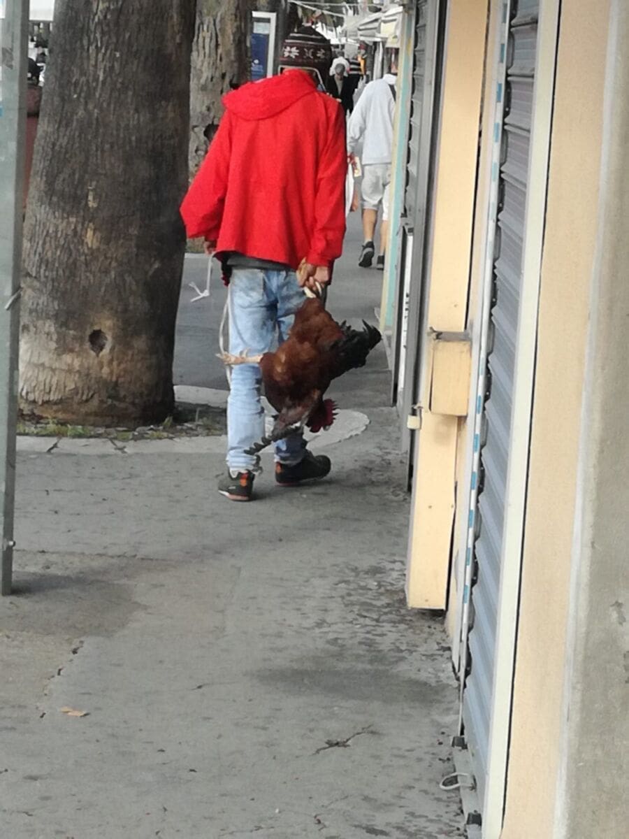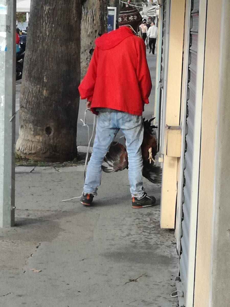 Malo ga je nosio držeći ga za nogu, malo ga je šetao na uzici, a sve u svemu, čini se da se radi o pripitomljenom pijetlu jer se nije puno bunio na način kako vlasnik postupa s njim.